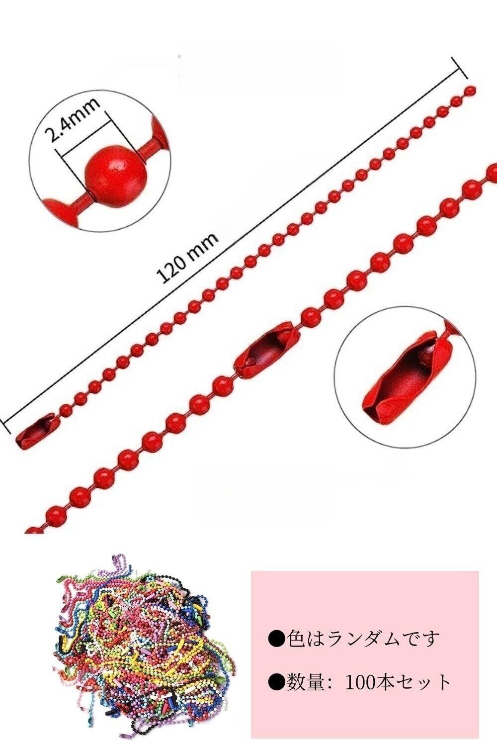 【商品内容】ボールチェーン100個セット(ランダムカラー)、サイズ:ボール径約2.4mm、全長約12cm(±0.5㎝)。