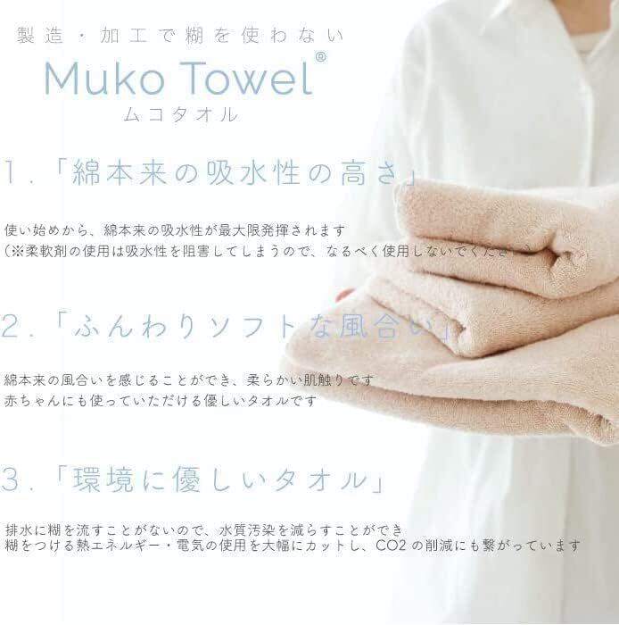 【人のお肌と環境に気づかったムコタオル】ムコタオル(=無糊タオル)は、製造工程で糊を使用しないで作りました。一般的なタオルは綿糸に糊をコーティングしないと織ることができないが、新田タオルは糊を付けずに織ることができます。その工程を省くことで綿本来の優れた吸水性と風合いを保ち、一般的なタオルに比べて、ソフトな風合いに仕上がっています。