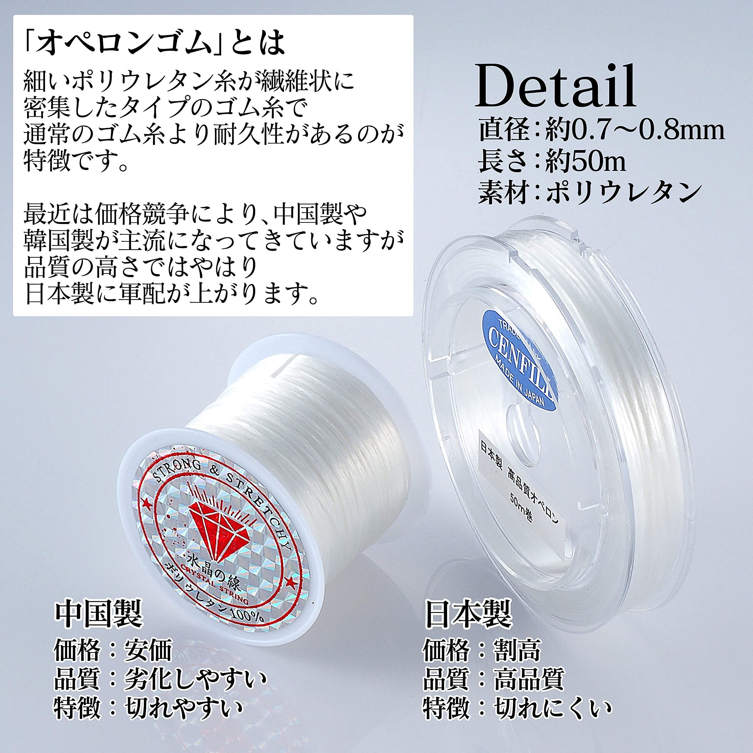伸び縮みするアクセサリーを作るときに使う日本製のオペロンゴム 【DIY】天然石ブレスレットの制作、手作りプレゼントや修理、組み換えの際に使用する非常に丈夫な伸縮性抜群のゴムひもです。 【ブレスレット用】ブレスレットの制作、手作りプレゼントや修理、組み換えの際に使用する非常に高品質な伸縮性抜群の弾力ひもです。 【高品質&材質】日本製オペロンは耐久性があり安全です。柔らかくて強い弾性ひも糸。ジュエリー作りなどに最適です。