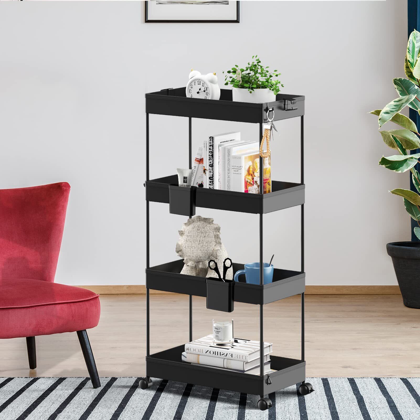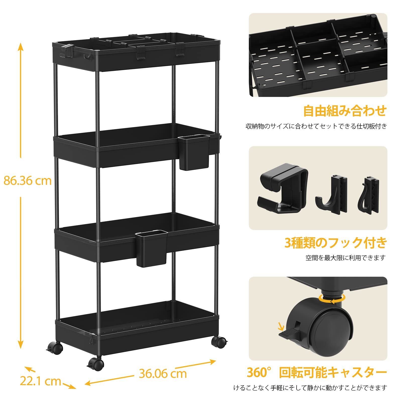 SPACEKEEPER キッチンワゴン 隙間収納 スリム 22cm 収納カップ 仕切板付き 多機能 小物 食品 調味料 キャスター付き 組立簡単 浴室 台所 冷蔵庫横 4段 ブラック