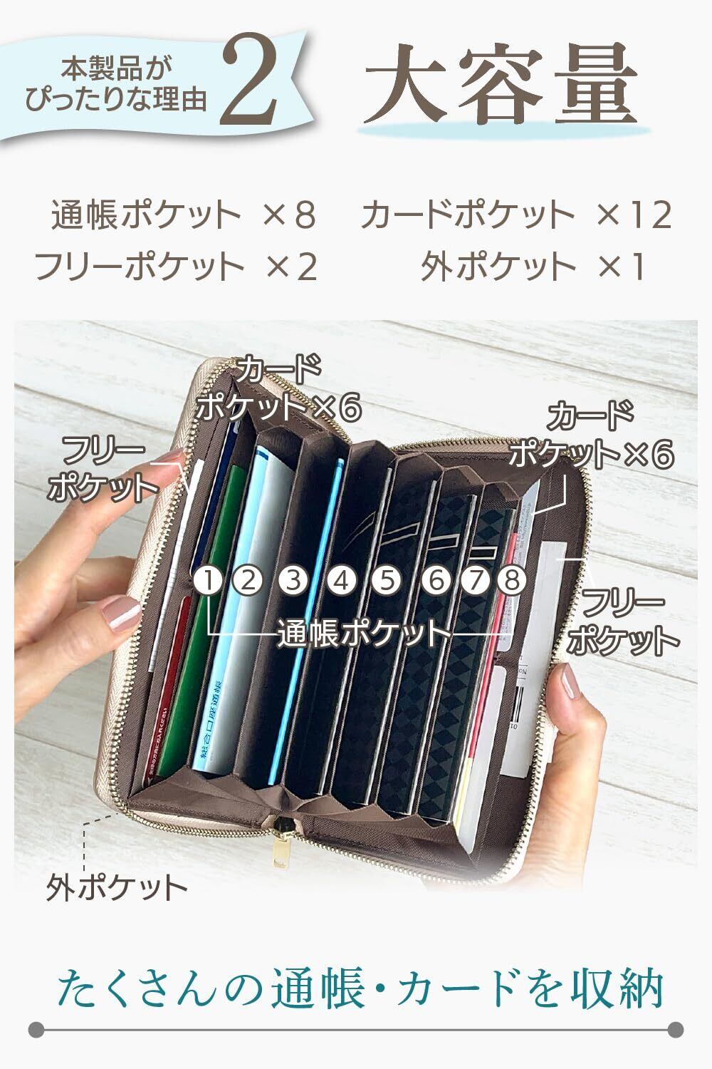 通帳ポケット×8、カードポケット×12、フリーポケット×2、外ポケット×1。