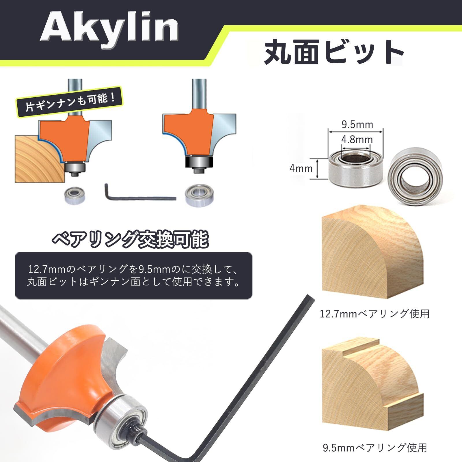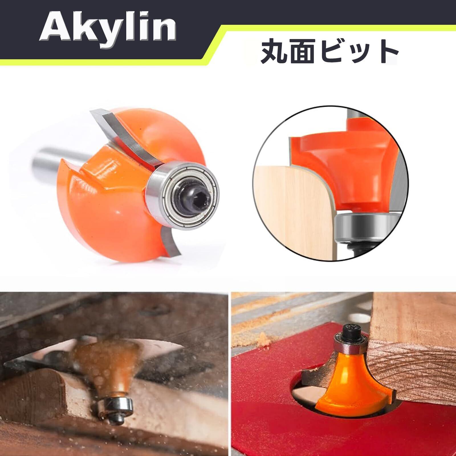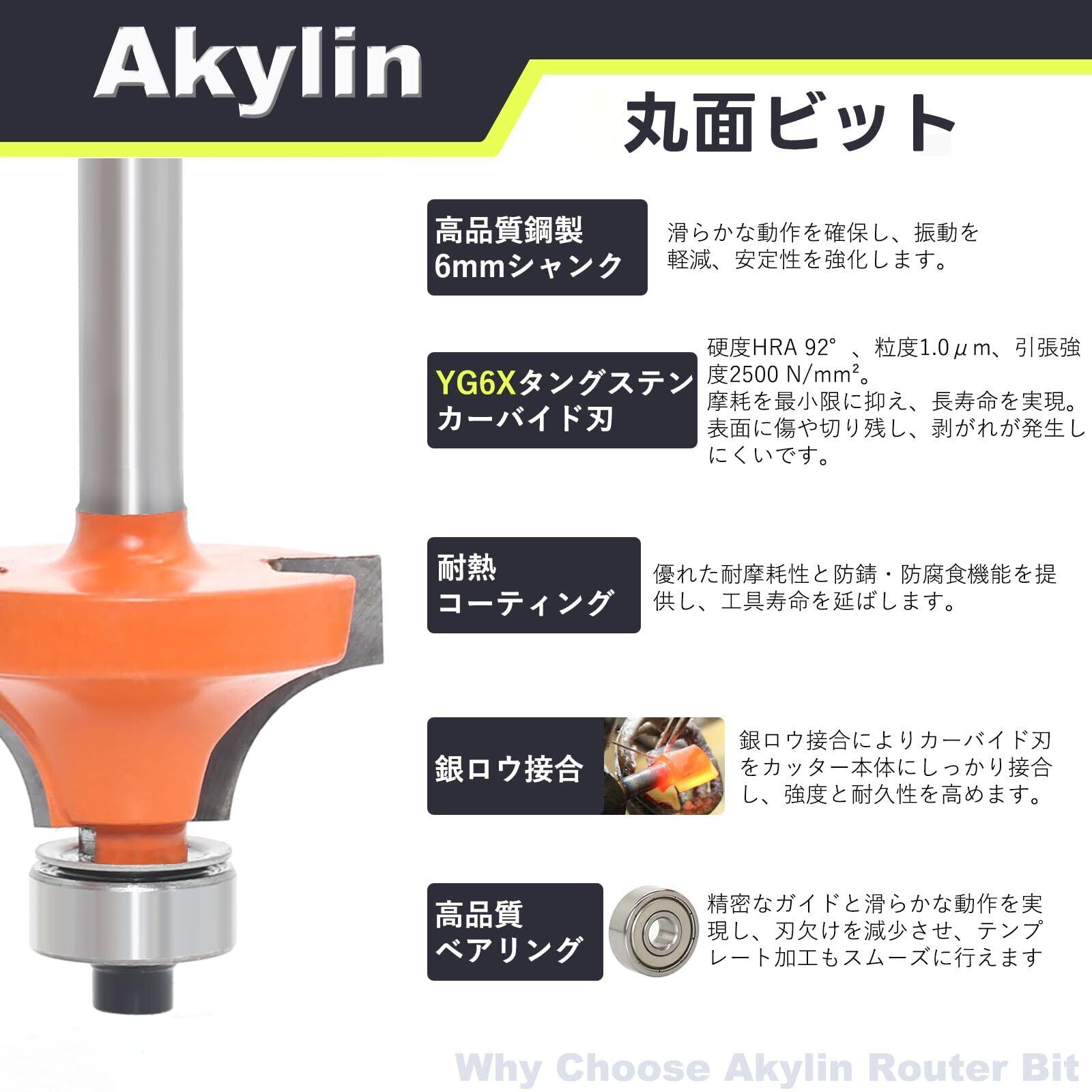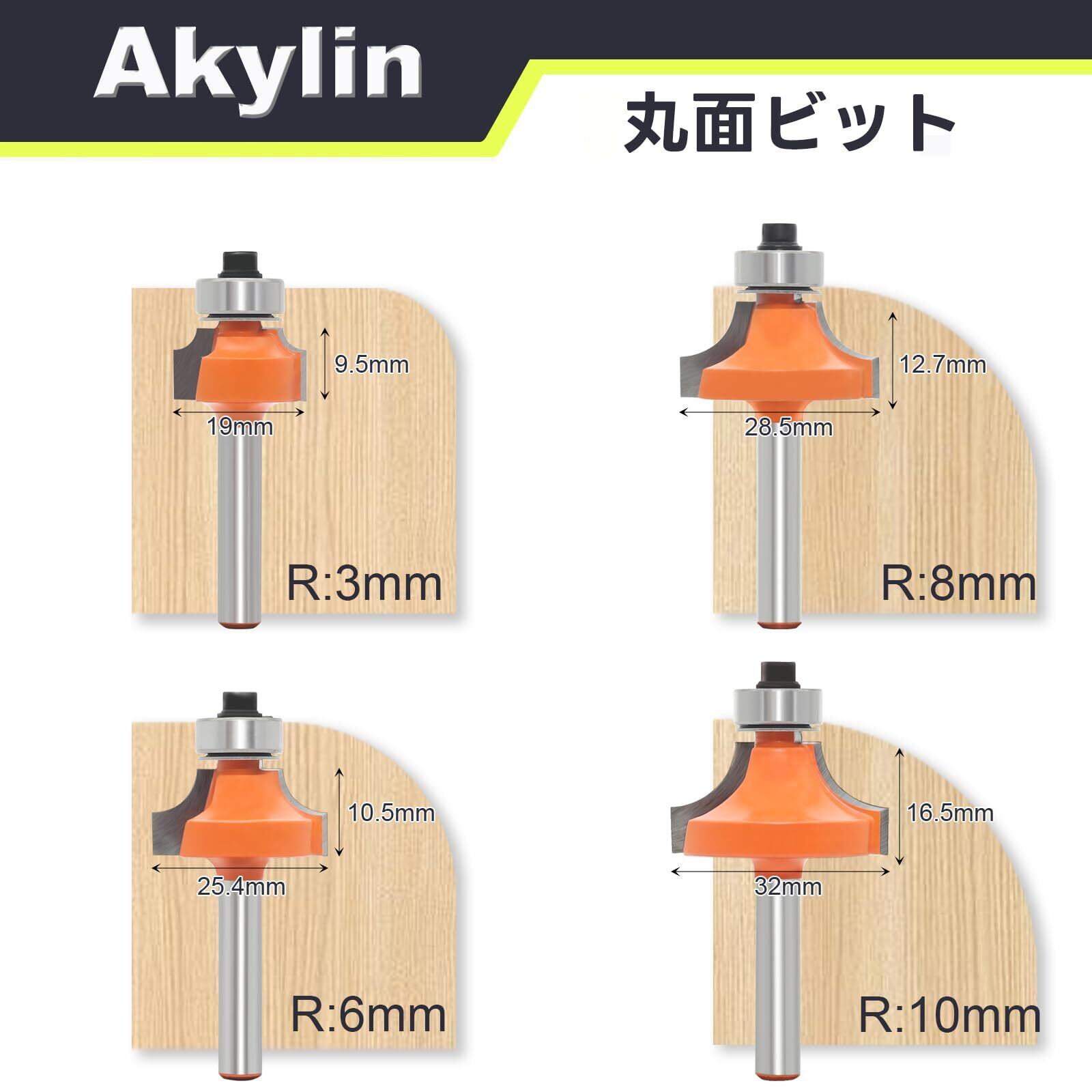 Akylin 4本セット ボーズ面ビット トリマービット 面取りビット 丸面ビット 6mm軸 超硬刃 ルータービット ボーズ面 面取り ギンナン面加工 ルータービット DIY木工用 切削工具 電動トリマービット 電動工具適用(R3-R6-R8-R10)