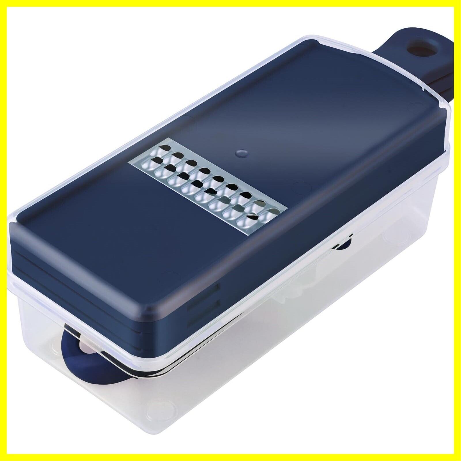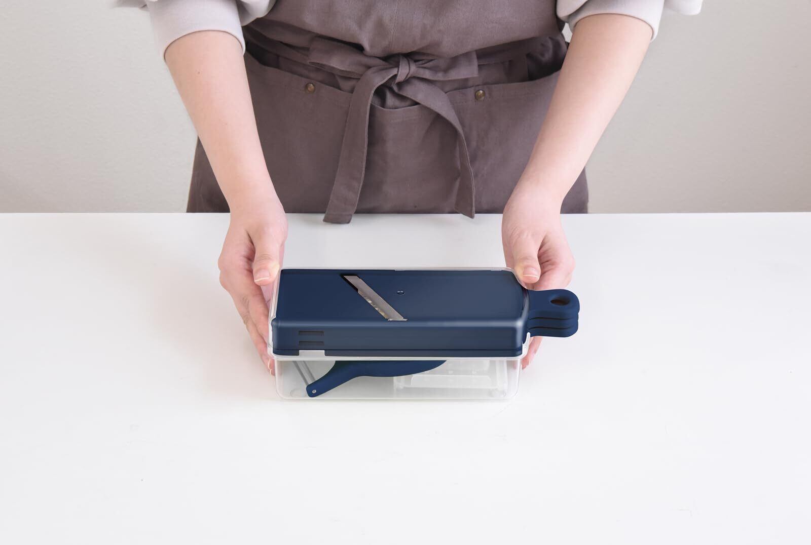 千切り、平切り、おろしのプレート3枚とピーラー、安全ホルダー、ケースとカバーが付いたお買い得7点セット。引出にコンパクトに収まるサイズ感で場所をとりません。