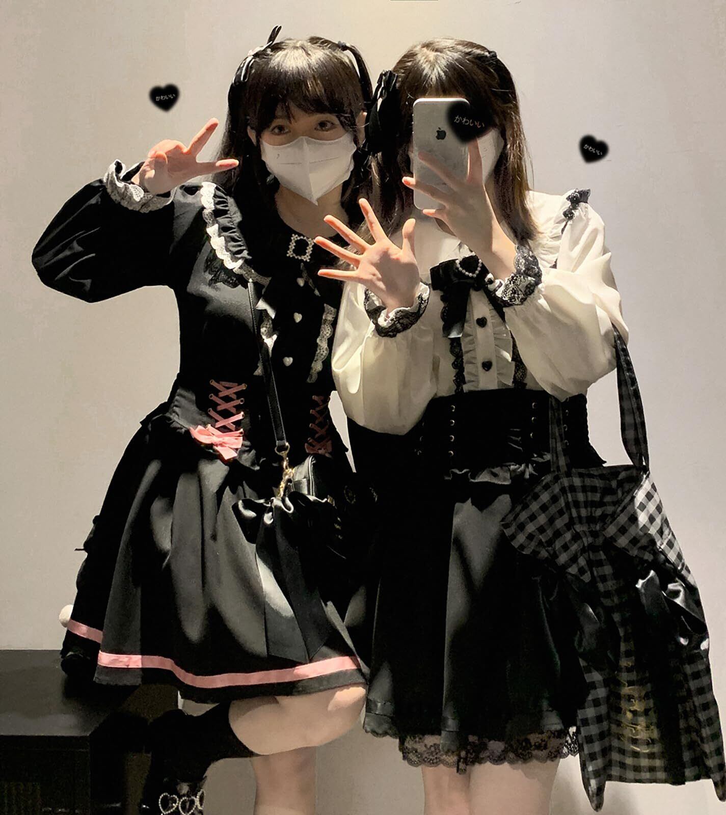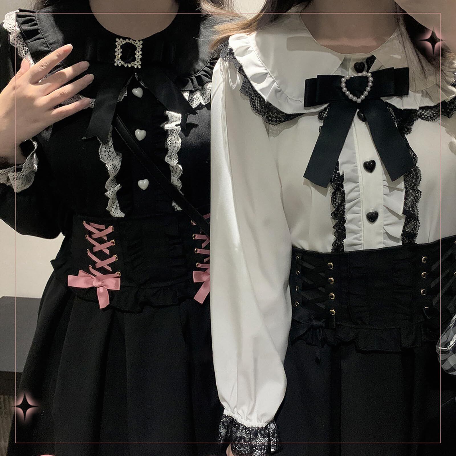 [XHSUKADO] 地雷系 ブラウス レディース 長袖 取り外し可能 リボン レース フリル ハートボタン ショート丈 ブローチ付き 量産型 トップス レディースブラウス シャツ おしゃれ 春 夏 秋