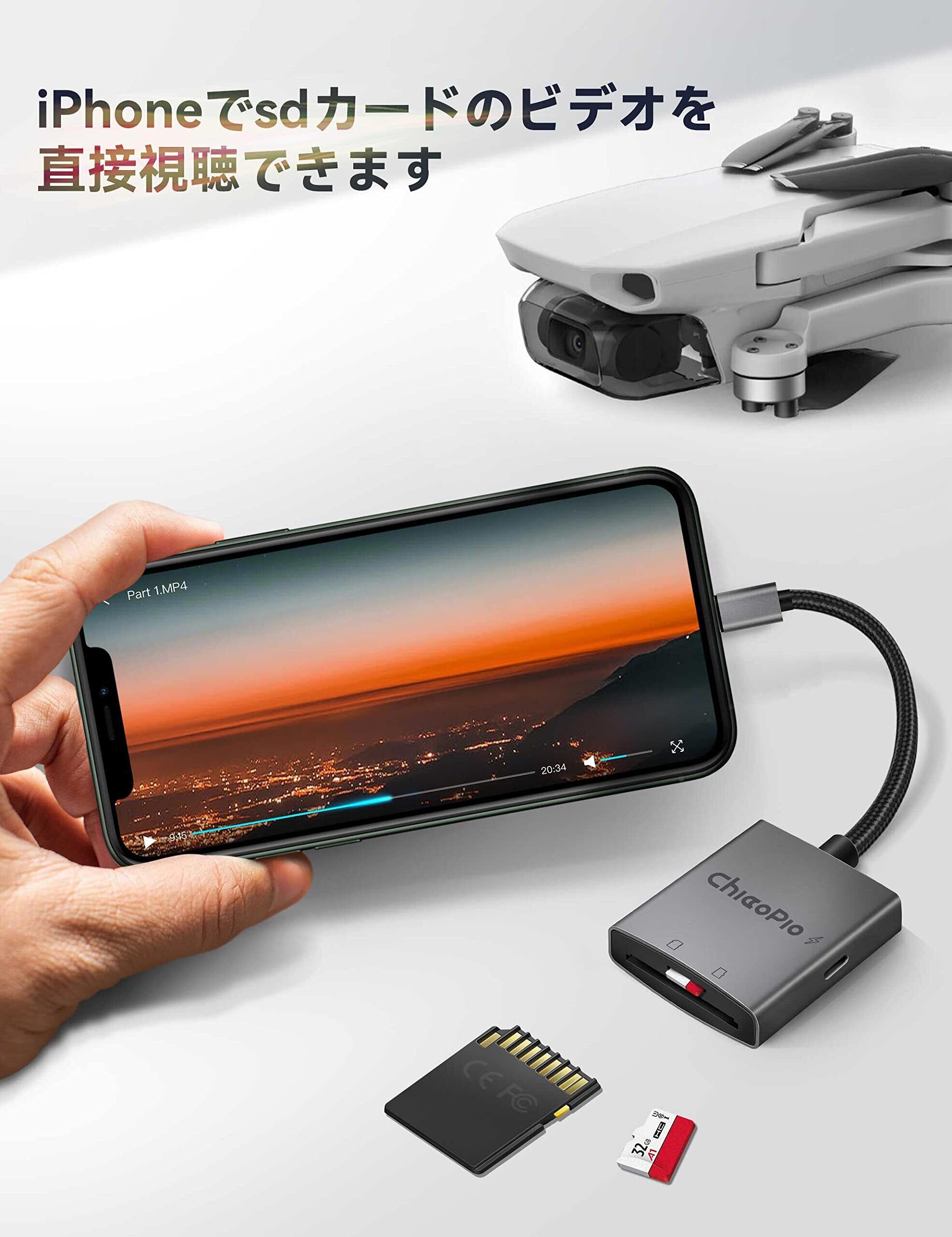 【ユニバーサル互換性】ChiaoPio iPhone用sdカードリーダーは、デジタルカメラ、スポーツカメラ、ドローン、トレイルゲームカメラのsdカードをサポートしています。 このSDカードからiPhoneへのアダプターを使用すると、ソーシャルメディアで素晴らしい瞬間をリアルタイムで共有できます。