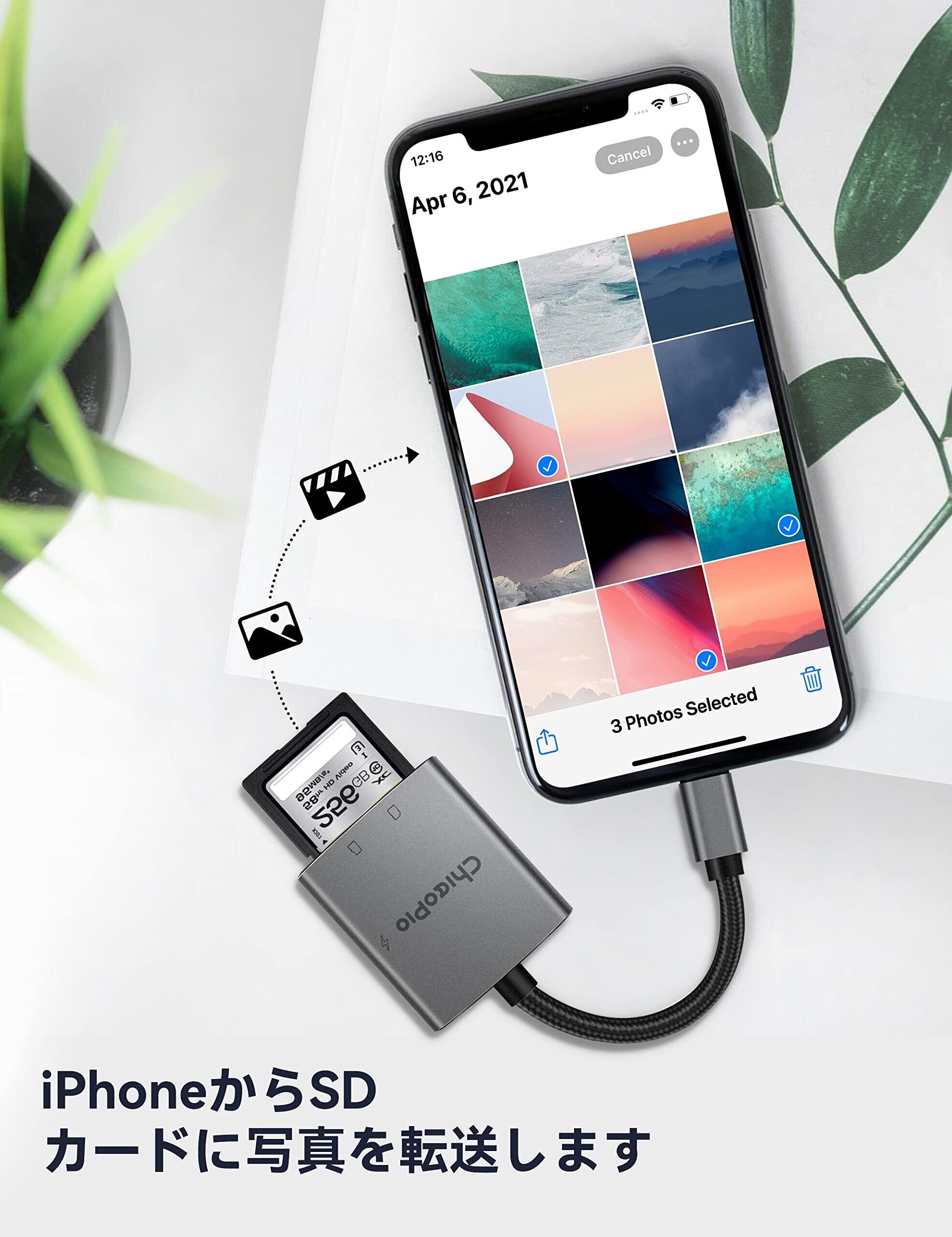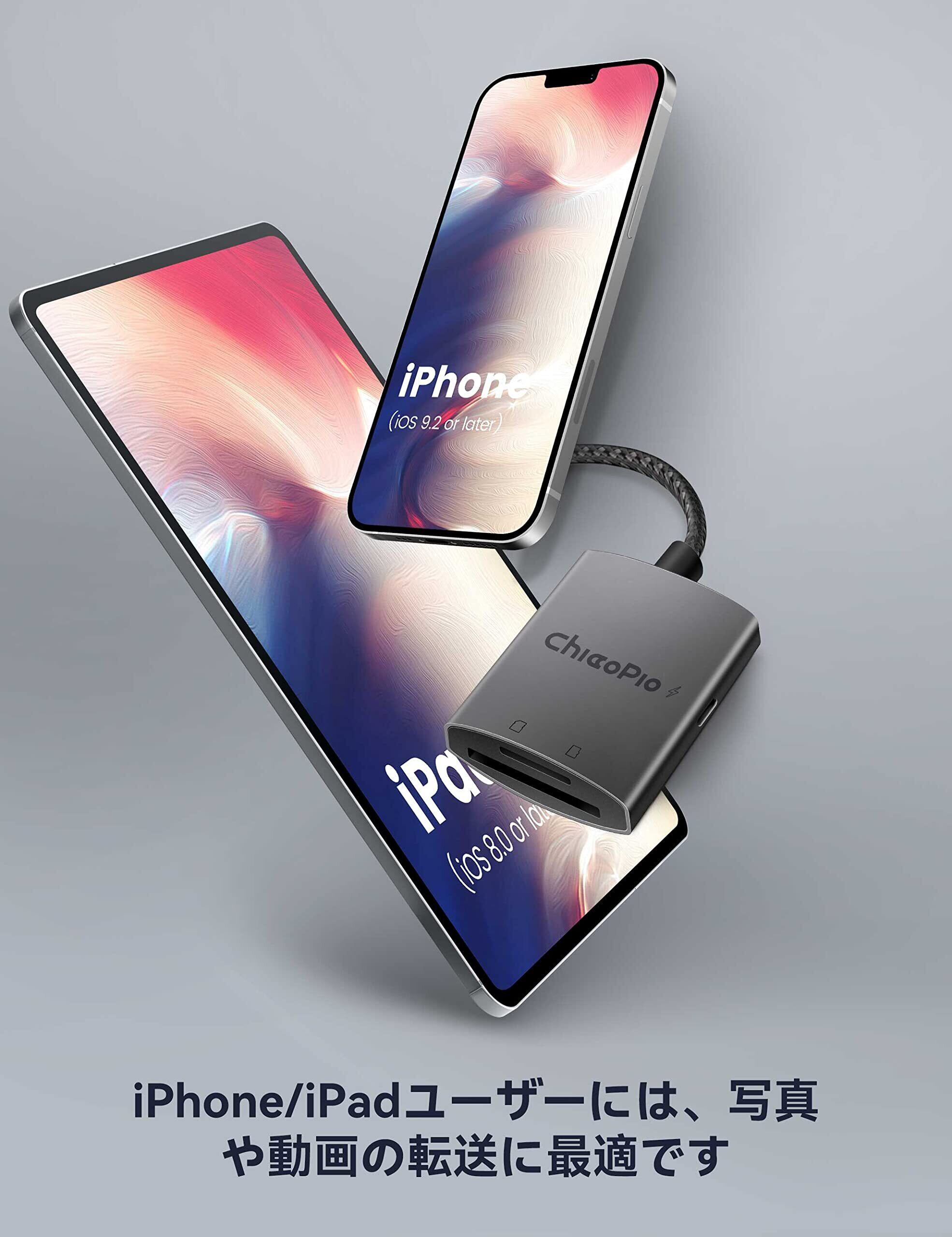 ChiaoPio SDカードリーダー 、iPhone/iPad用 SDカードリーダー、カメラカードビューアー、SDカードリーダーアダプター、アプリ不要、プラグアンドプレイ