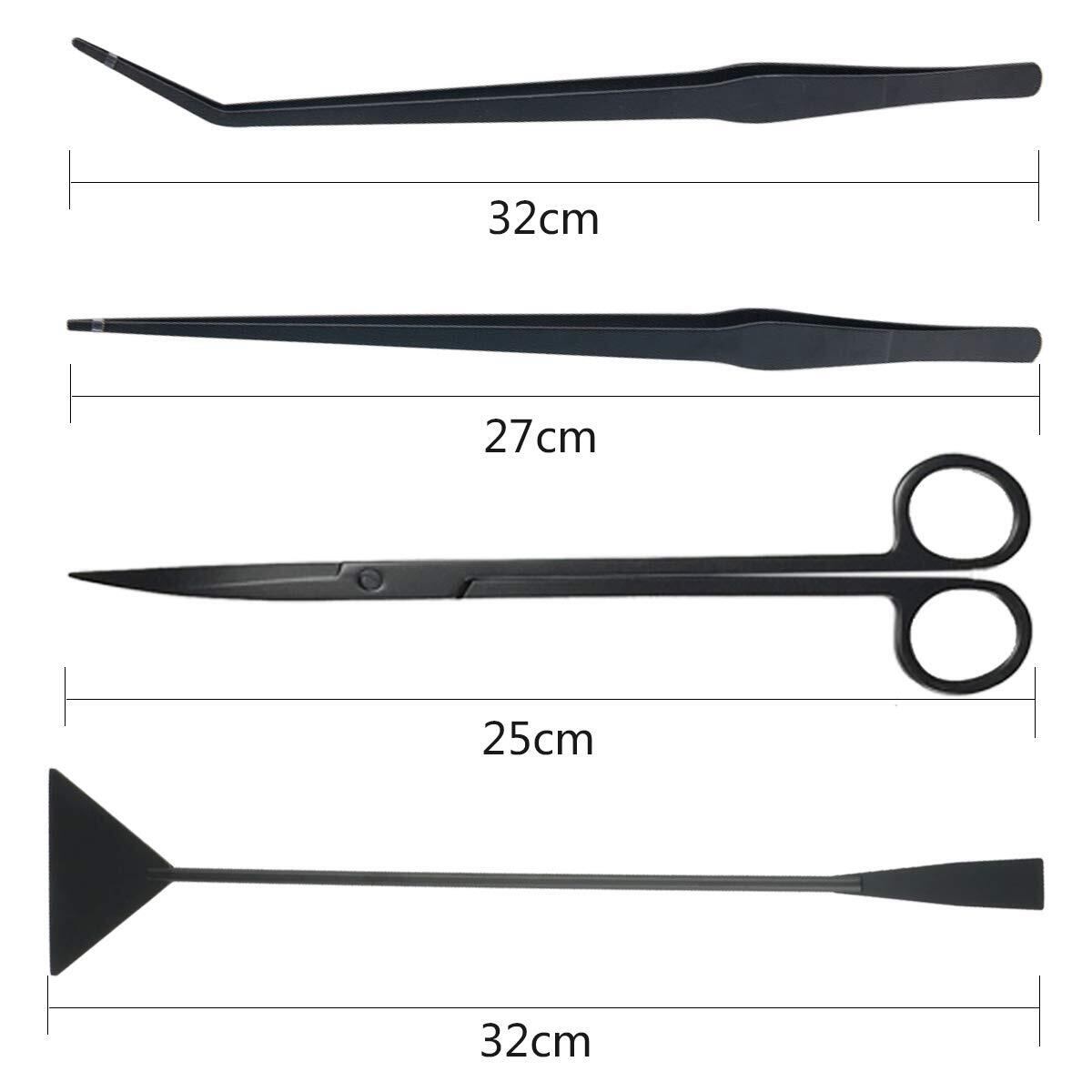【水草用トリミング用具】 1x カーブ ハサミ( 長さ:25cm) カーブ ピンセット(長さ:27cm) ストレート ピンセット(長さ:27cm) サンドフラッター (長さ: 32cm) 合計4点セット。(専用収納バッグが付きなので、使用したあとはタオルかキッチンペーパーなどで拭きしっかり乾燥させてバッグにおいたほうがお進めます。)