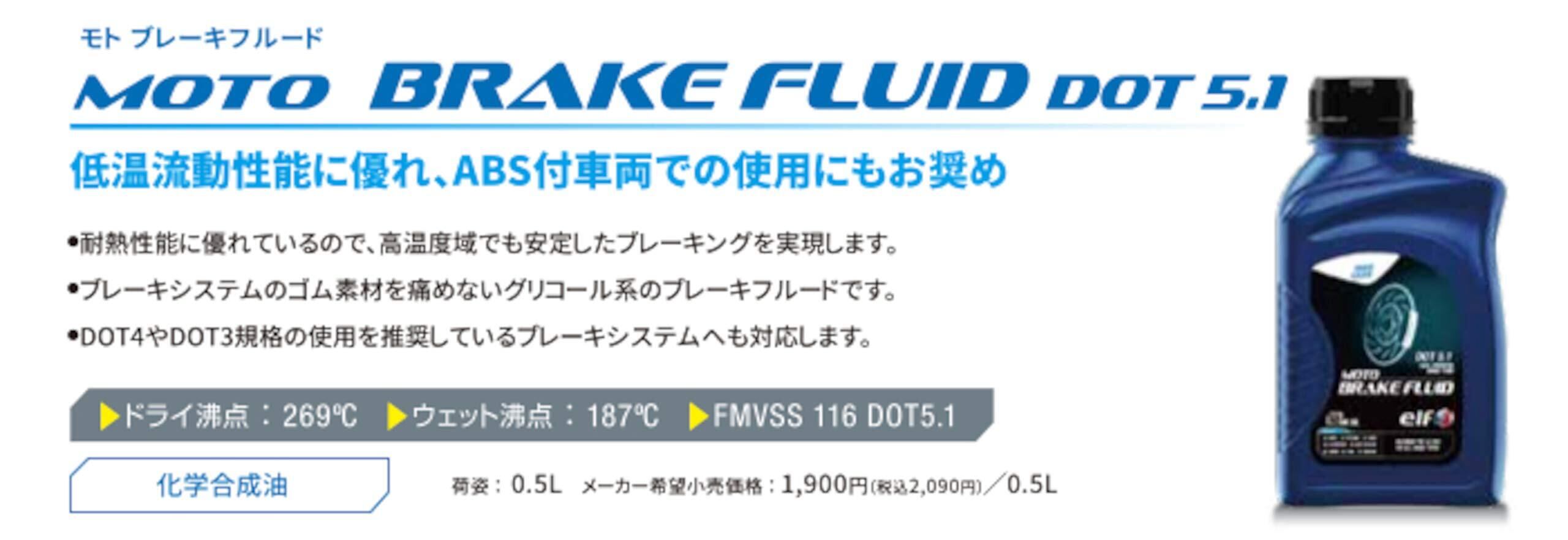 モト ブレーキフルード DOT5.1 低温流動性能に優れ、ABS付車両での使用にもお奨め 耐熱性能に優れているので、高温度域でも安定したブレーキングを実現します。 ブレーキシステムのゴム素材を痛めないグリコール系のブレーキフルードです。 DOT4やDOT3規格の使用を推奨しているブレーキシステムへも対応します。