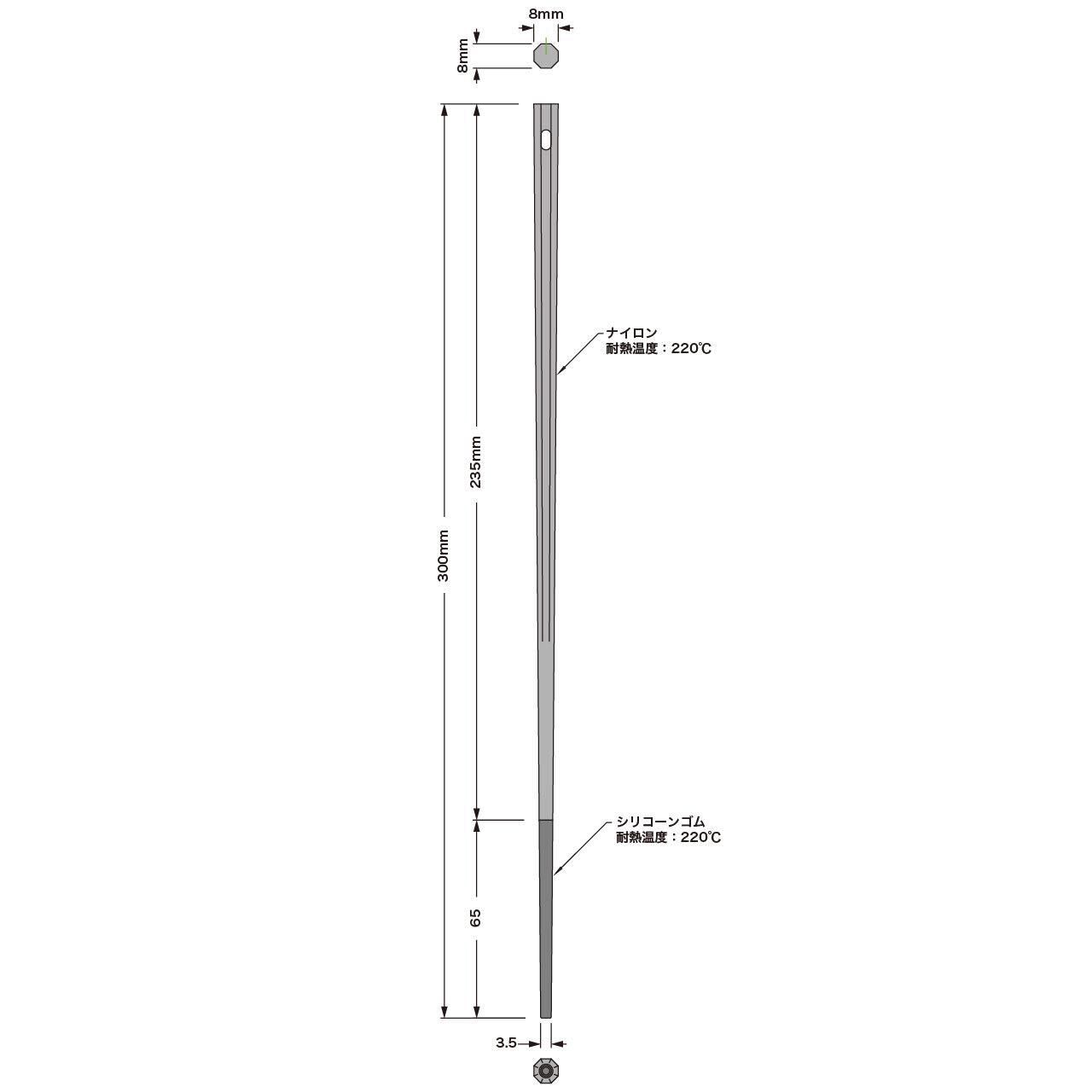 持ちやすくて食材もつかみやすい!料理や盛り付けがラクに楽しくなる、使いやすいシリコン菜箸です。 使いやすさの秘密は先端に施された「シボ加工」と持ち手の「八角形」の形状。 「シボ加工」とは、表面に微細な凹凸をつけることを指し、滑り止めの効果があります。これによりシリコン部分全体に滑り止め効果をもたせています。 また、持つ部分を八角形にすることで持ちやすさと転がりにくさを両立させました。 持つ分の上部には穴が開いているので紐を通すこともできます。紐を通せば引っかけて収納することも可能。 料理の時でも収納するときでも、どんなシーンでも使い勝手のいいシリコン菜箸です。