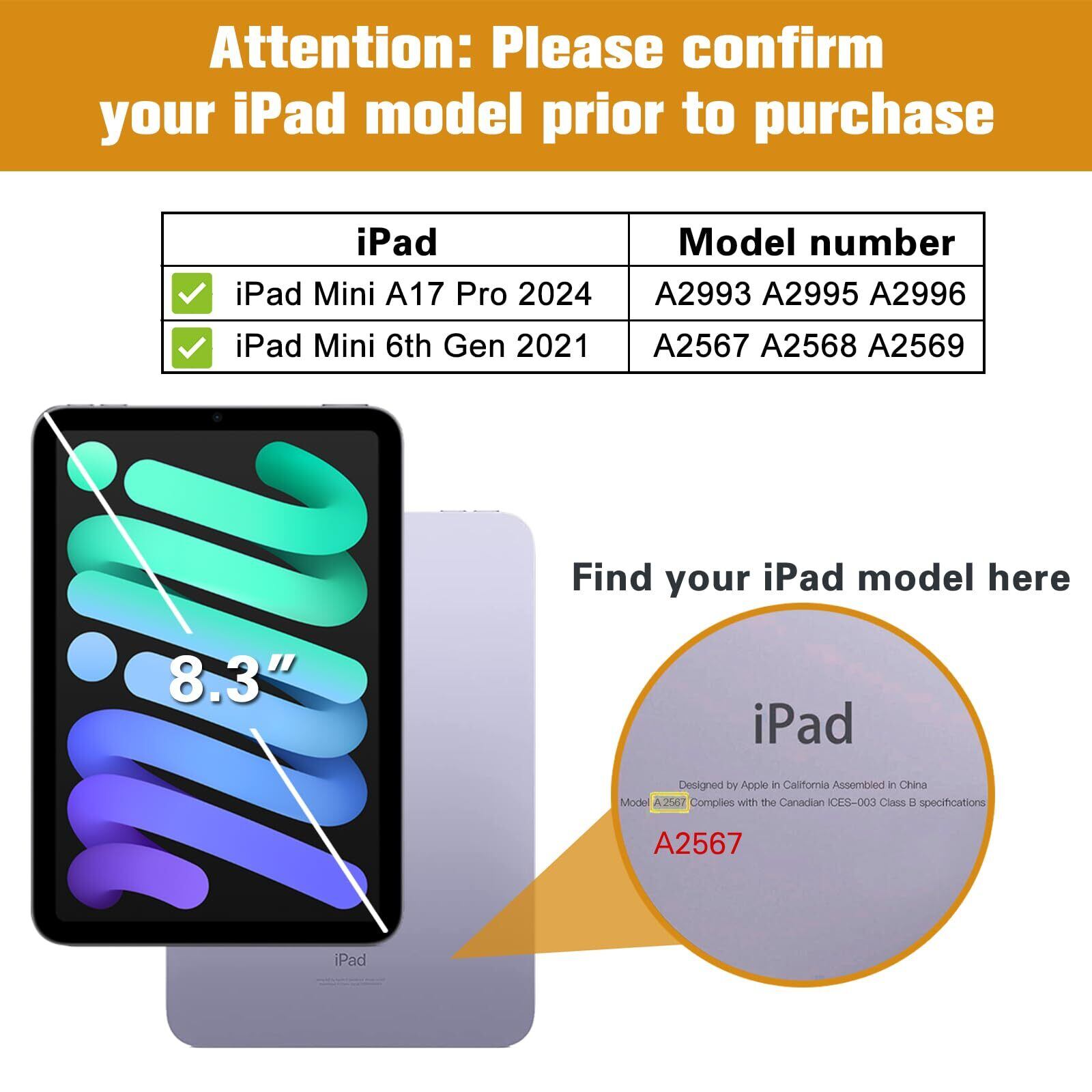 対応機種:iPad Mini A17 Pro 第7世代 2024(モデル番号:A2993 / A2995 / A2996)、iPad Mini 6 2021発売 8.3インチ(モデル番号:A2567 / A2568 / A2569)他のモデルには対応しません。 ご購入前にお持ちの端末のモデル番号をご確認ください。