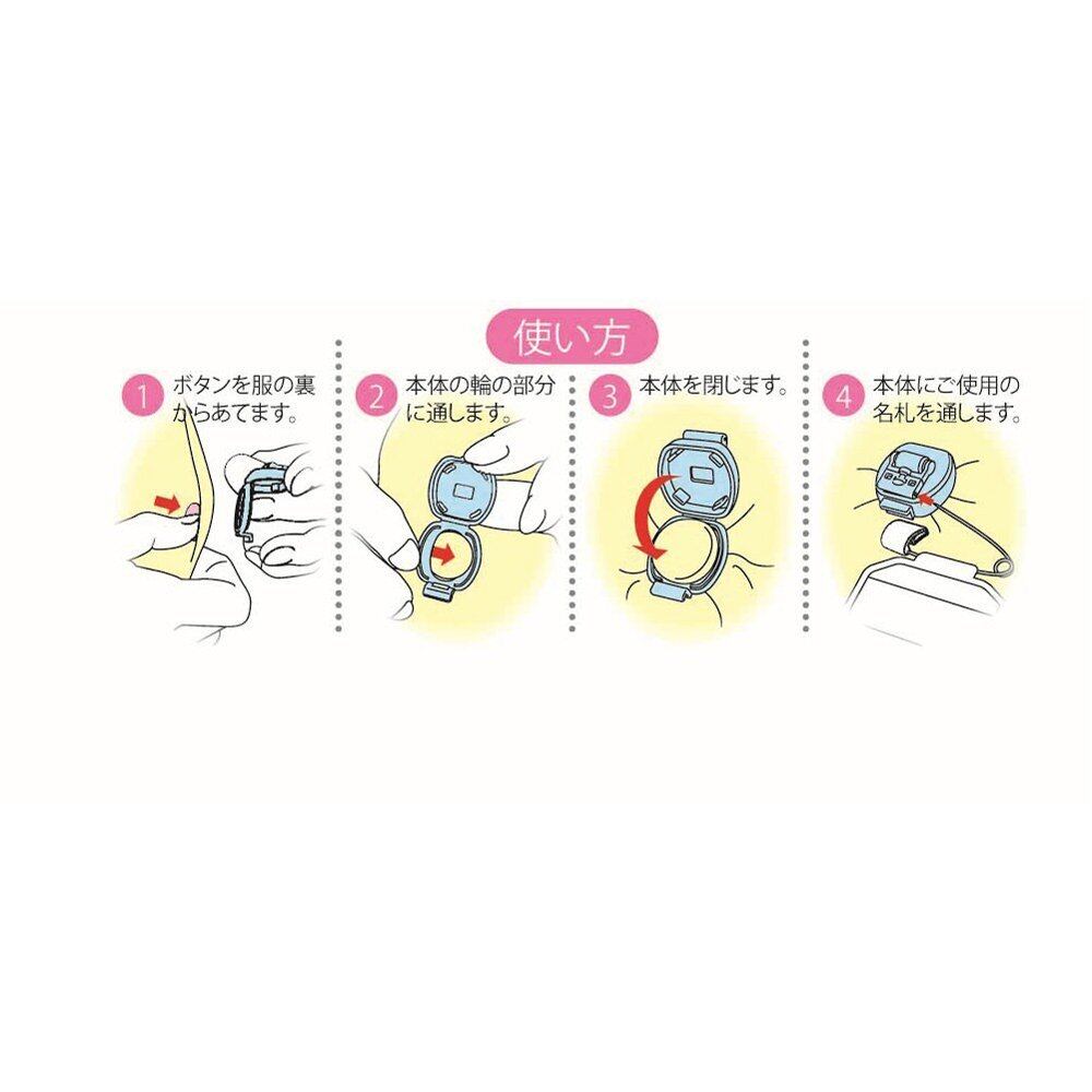 付属のボタンを使う事で、衣類に穴を空けずに取り付けられる名札。