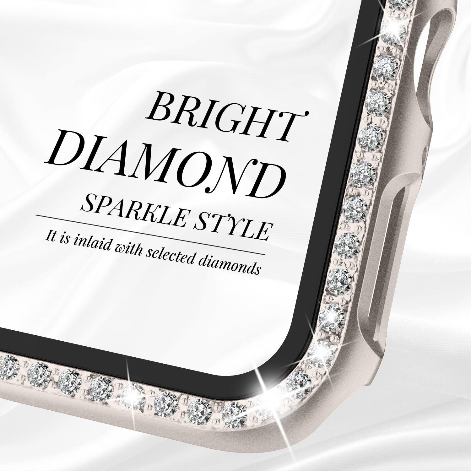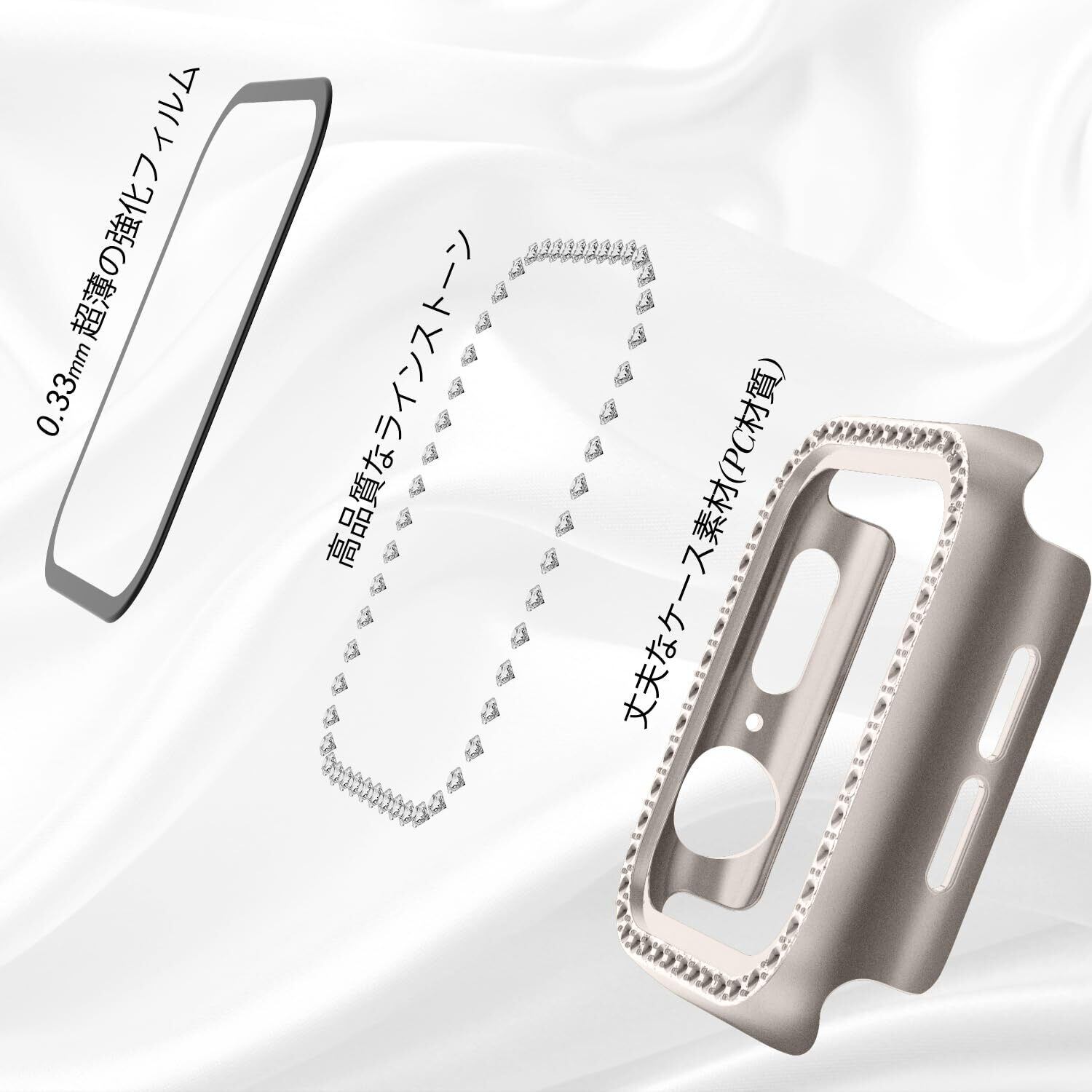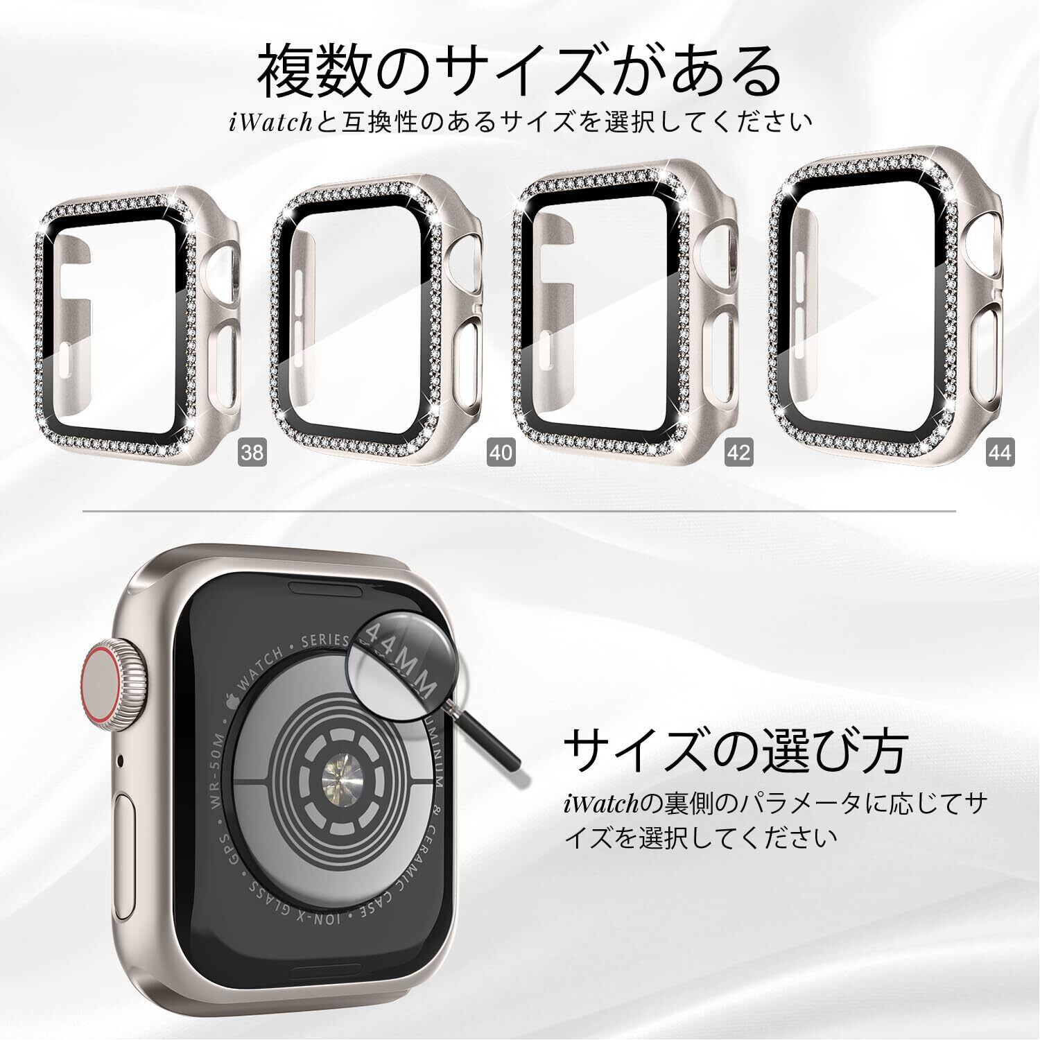 「WASPO AppleWatch ダイヤ付き保護ケース」とは、Apple Watchシリーズ10の42/46mm、シリーズ9/8/7の41/45mm、シリーズ6/5/4/SEの40/44mm、シリーズ3/2/1の38/42mm,、女性専用に設計されて、スクリーンプロテクター(強化ガラスフィルム)付きのAppleWatchラインストーン式保護ケース。