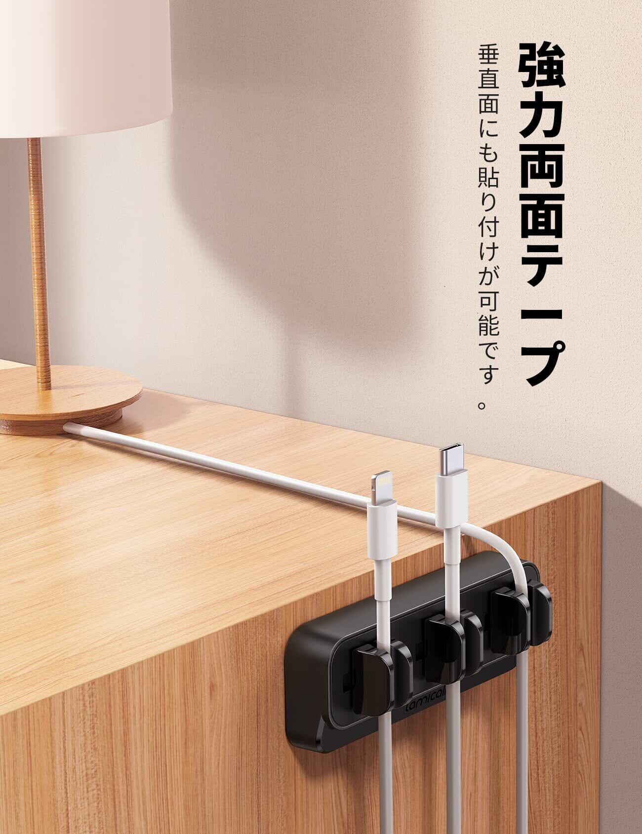 【強力両面テープ】強力な両面テープを使用して、木製やガラス製、ガラス製や大理石などの色々な材質に対応でき、剝がれ落ちる心配はありません。デスクや床のような場所の他、壁や家具の側面、車内などの垂直面にもケーブルをすっきり固定できます。ケーブルの固定も簡単で、非常に便利で効率よいアイテムです。