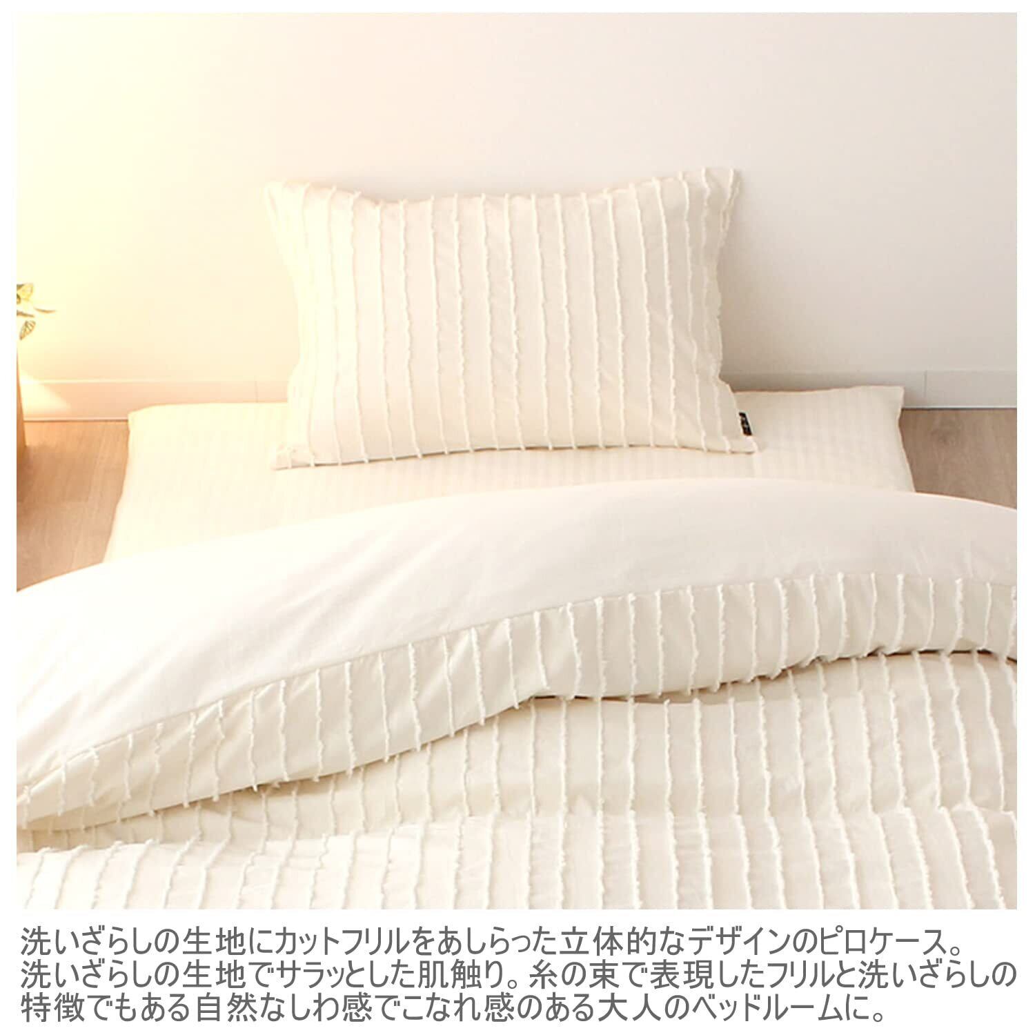 洗いざらしの生地にカットフリルをあしらった立体的なデザインの枕カバー。洗いざらしの生地でサラッとした肌触り。糸の束で表現したフリルと洗いざらしの特徴でもある自然なしわ感でこなれ感のある大人のベッドルームに。
