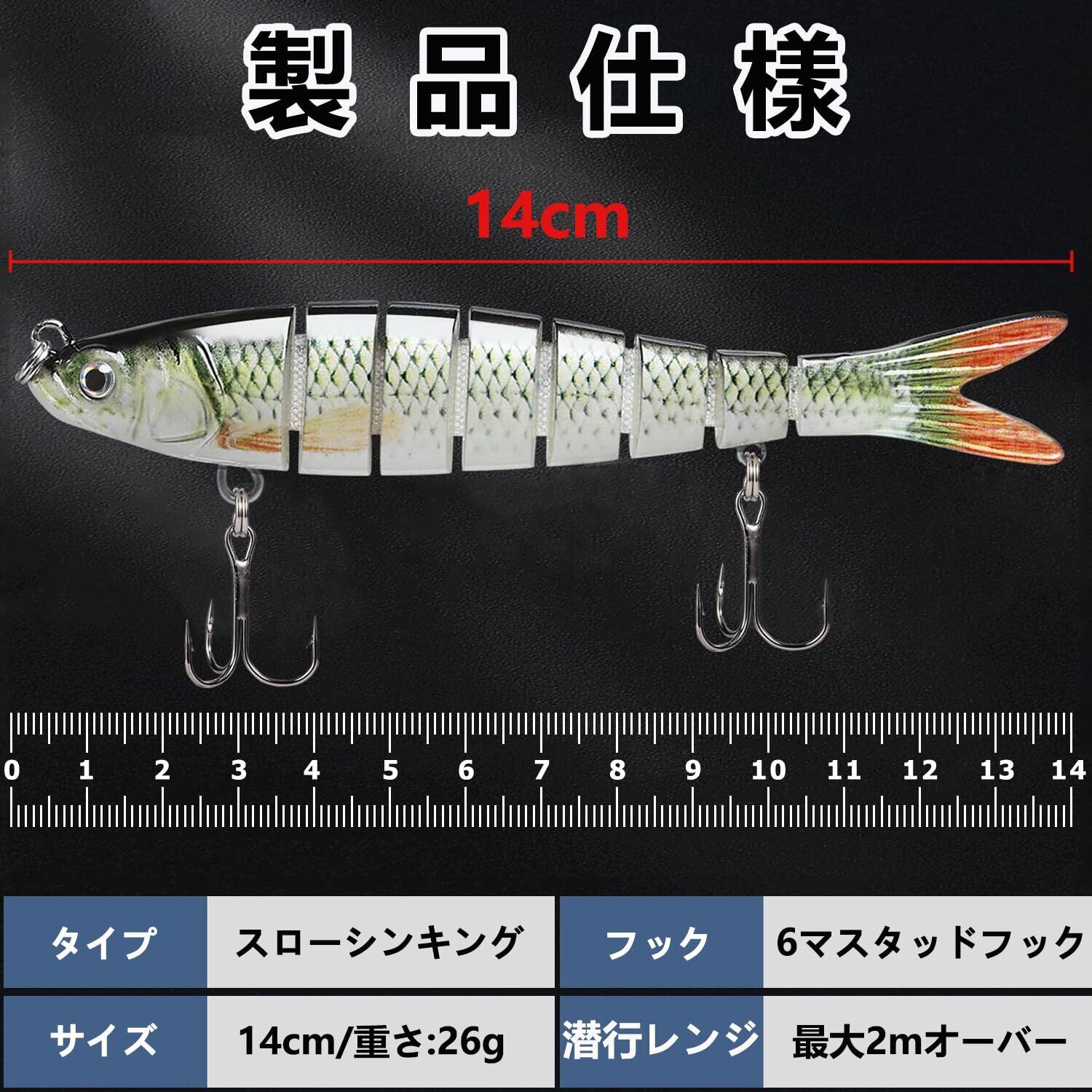 【材質】本体の固い部分はABSプラスチックで作られ、長さ:14cm;幅:2.5cm;重さ:26g、各部の連結部分はPE製です。繋ぎのPEベルトは強靭で魚に噛まれても切ることはご心配無用です;フック部分は高炭素鋼製です。本体の表面ではレーザーペンキがあり、水中の光線を反射し、より広範囲でターゲットにアピールします。飛行姿勢が安定し、当社測定で平均45mもの飛距離を達成。