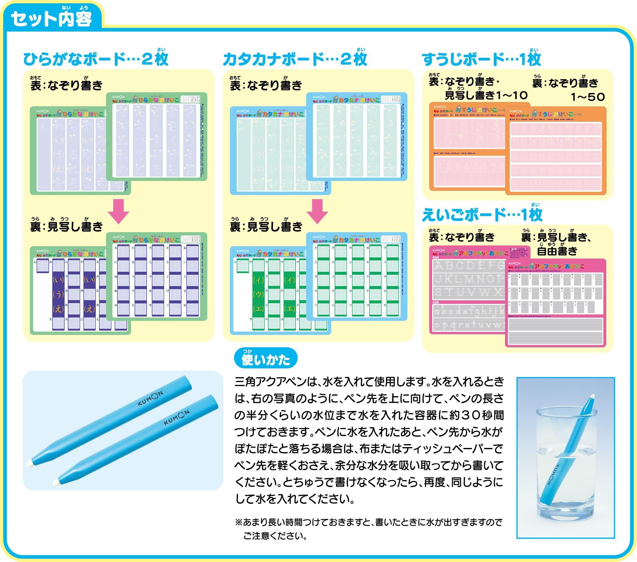 セット内容:ひらがなボード2枚 、カタカナボード2枚、すうじボード1枚、えいごボード1枚、三角アクアペン2本