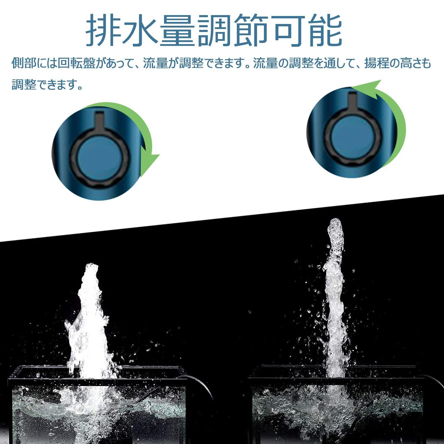 【吐出量調整可能】循環ポンプの正面に流量調整ノッブが付いて、吐出量が最大600L/Hまで、揚程は1.2Mまで調整できます。流量の調整を通して、揚程の高さも微調整できます。(揚程量は水道管の揚水高さであり、給水ポンプが直接に噴水の高さが大きく違います。)