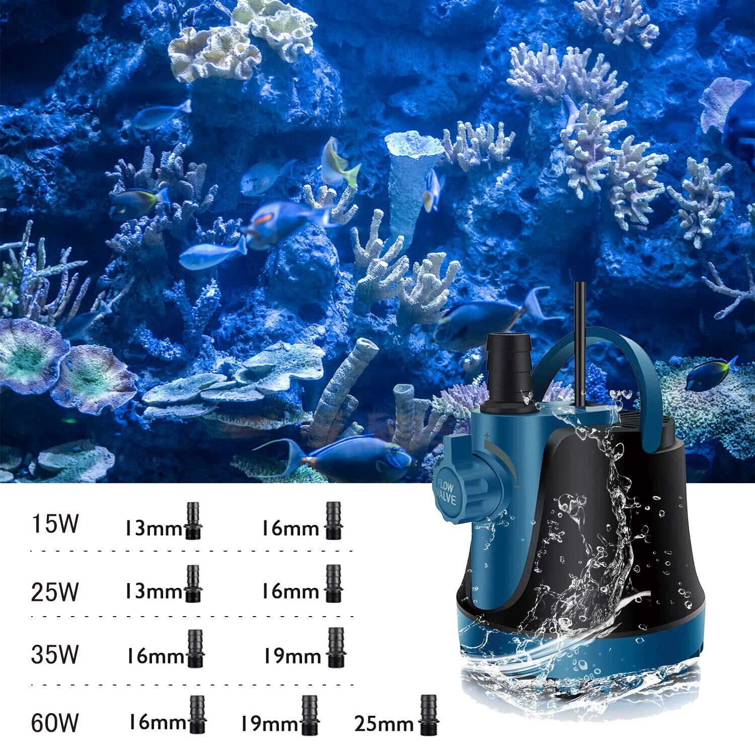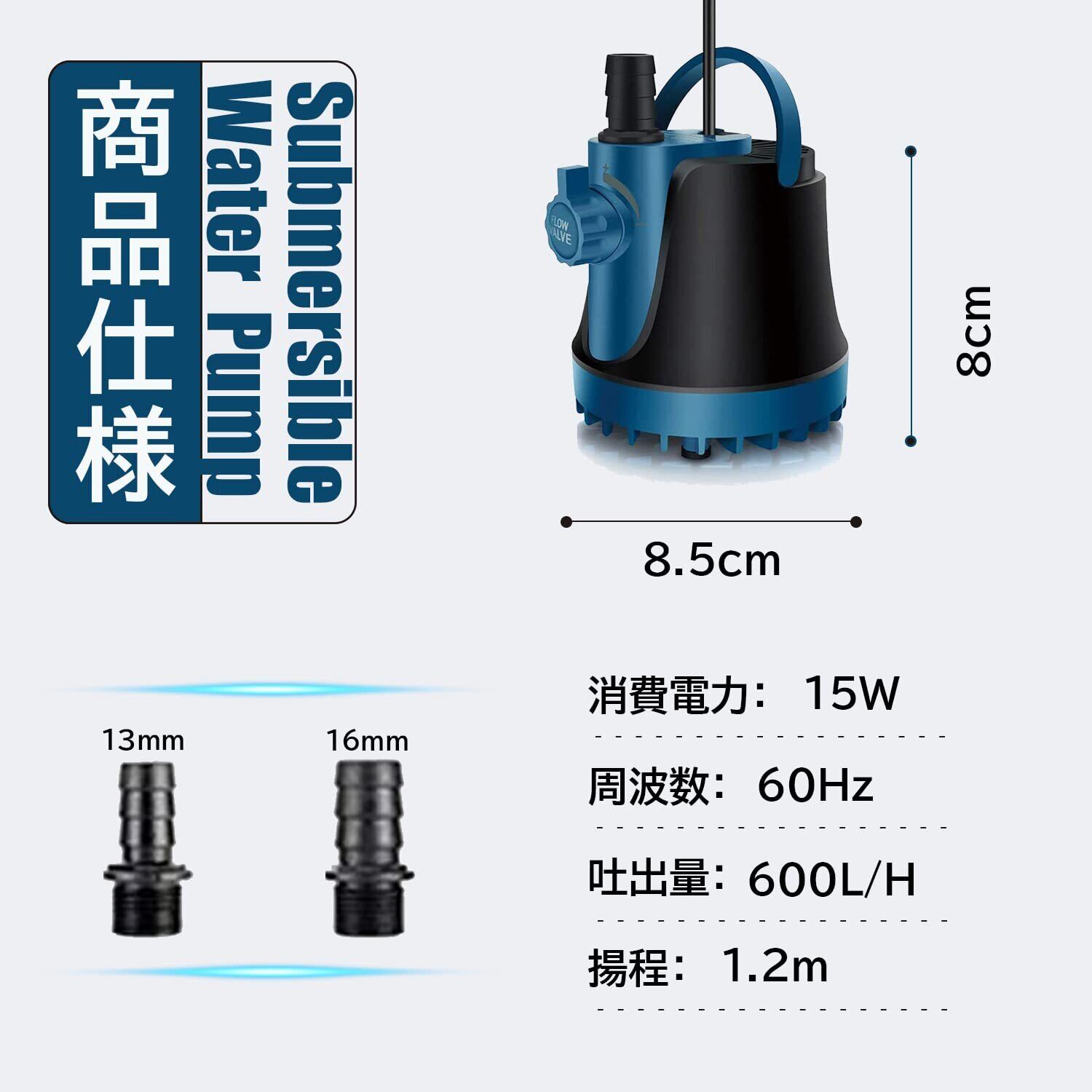 【商品仕様】・入力電圧:AC 100V ・周波数:60Hz ・電力:15W ・最大流量:600L/H ・最大揚程:1.2Mぐらい ・ノズルサイズ:13mm&16mm ・騒音クラス:40デシベル以下 ・電源コードの長さ:1.9M