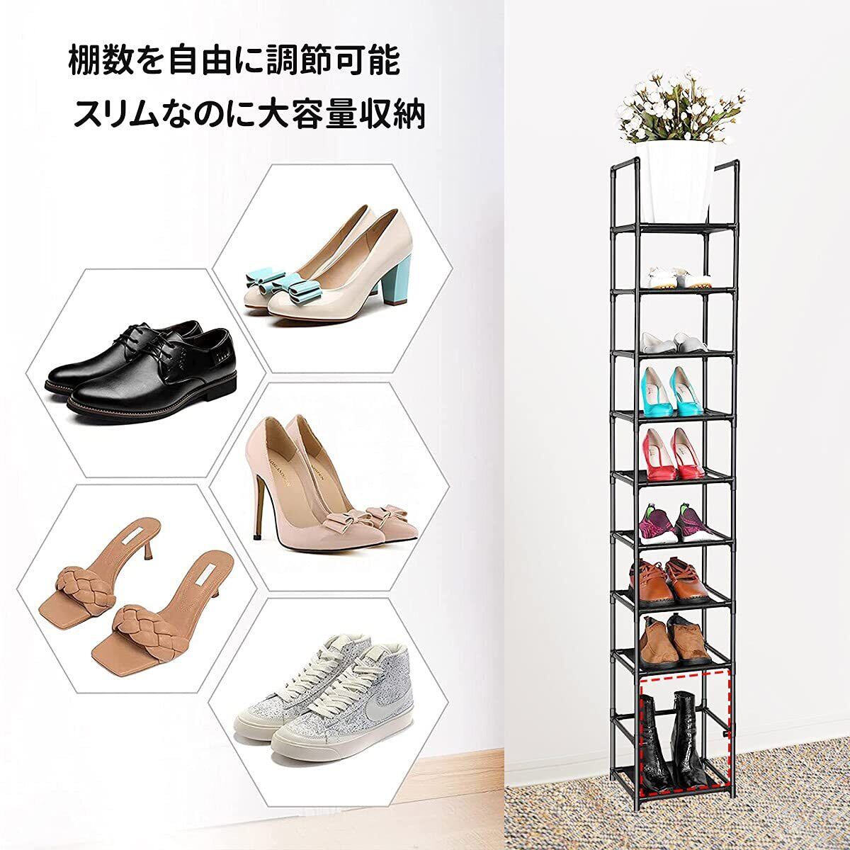 【省スペース 大容量のシューズラック ブラック】サイズ:幅約30×奥行30×高さ176cm,靴ラックは、最大10足収納可能。スリムなので、限られたスペースの玄関でも、空間を圧迫せずにたくさんの靴を収納できます。扉や壁がないので通気性も良く、湿気やニオイがこもりません。
