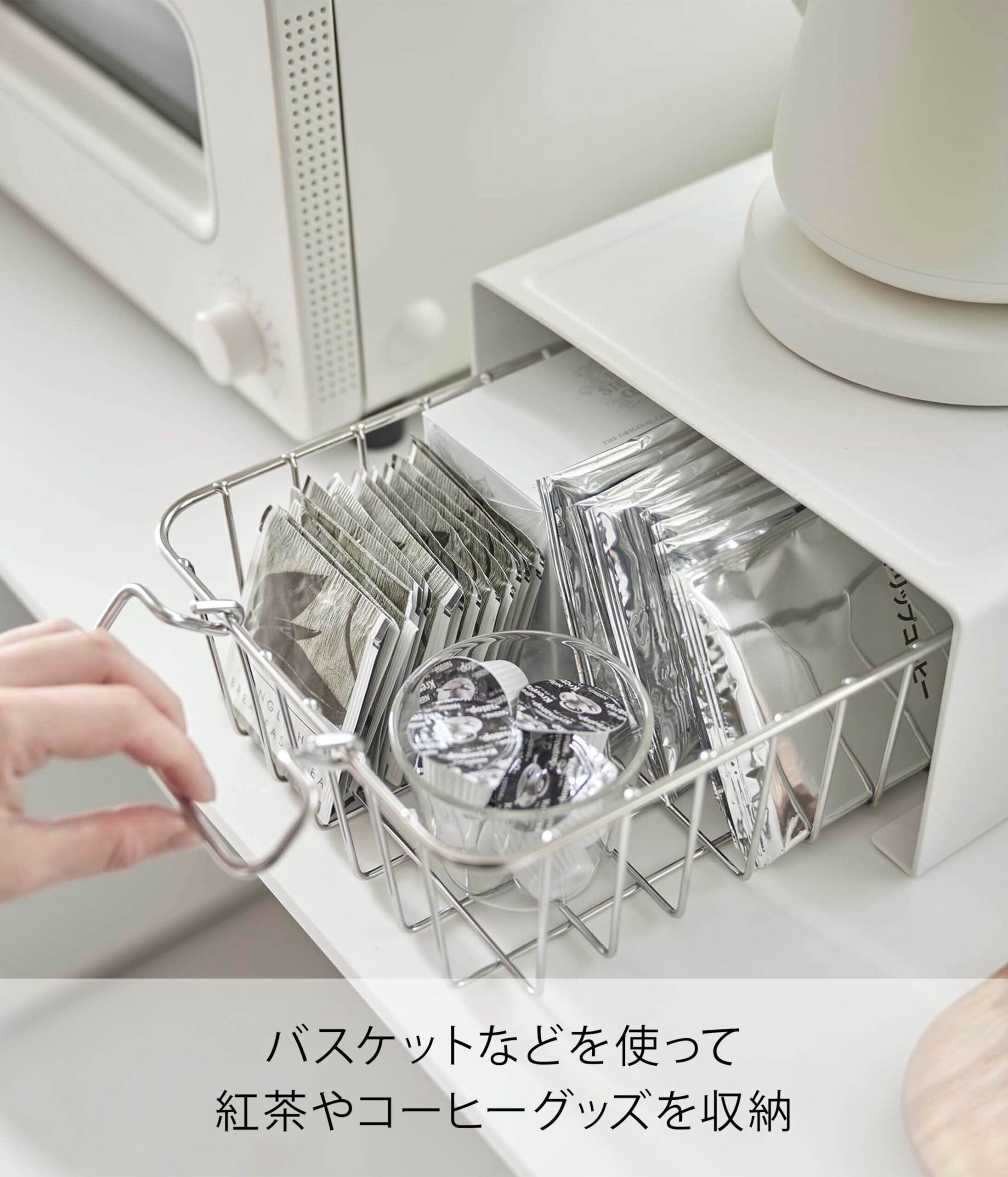 バスケットなどを使って紅茶やコーヒーグッズを収納したり、トレーにコップを置いて収納しても便利。