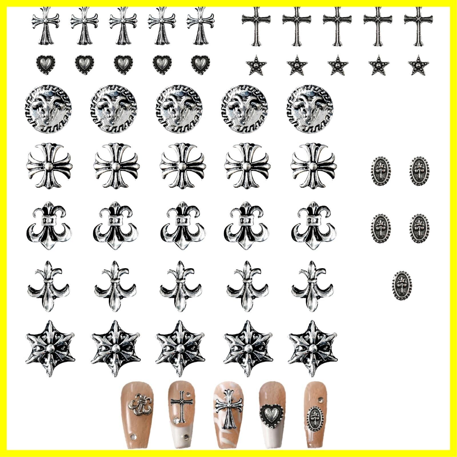 BTtime 50個のパンクネイルアートチャーム ネイルパーツ メタルパーツ 3D スタッズ デコパーツ レトロ 十字架 パンク ネイルリベット ネイルパーツ ネイルデザイン用品DIYクラフトアクセサリー (ヴィンテージシルバー)