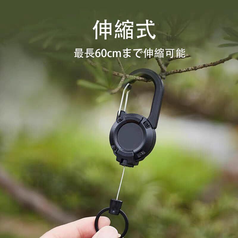 【素材、仕様】: リールキーホルダー ABSプラスチック(ボディ)、亜鉛合金(カラビナ)、金属ワイヤー(コード)、重さ:約30G、伸縮長:約60cm。