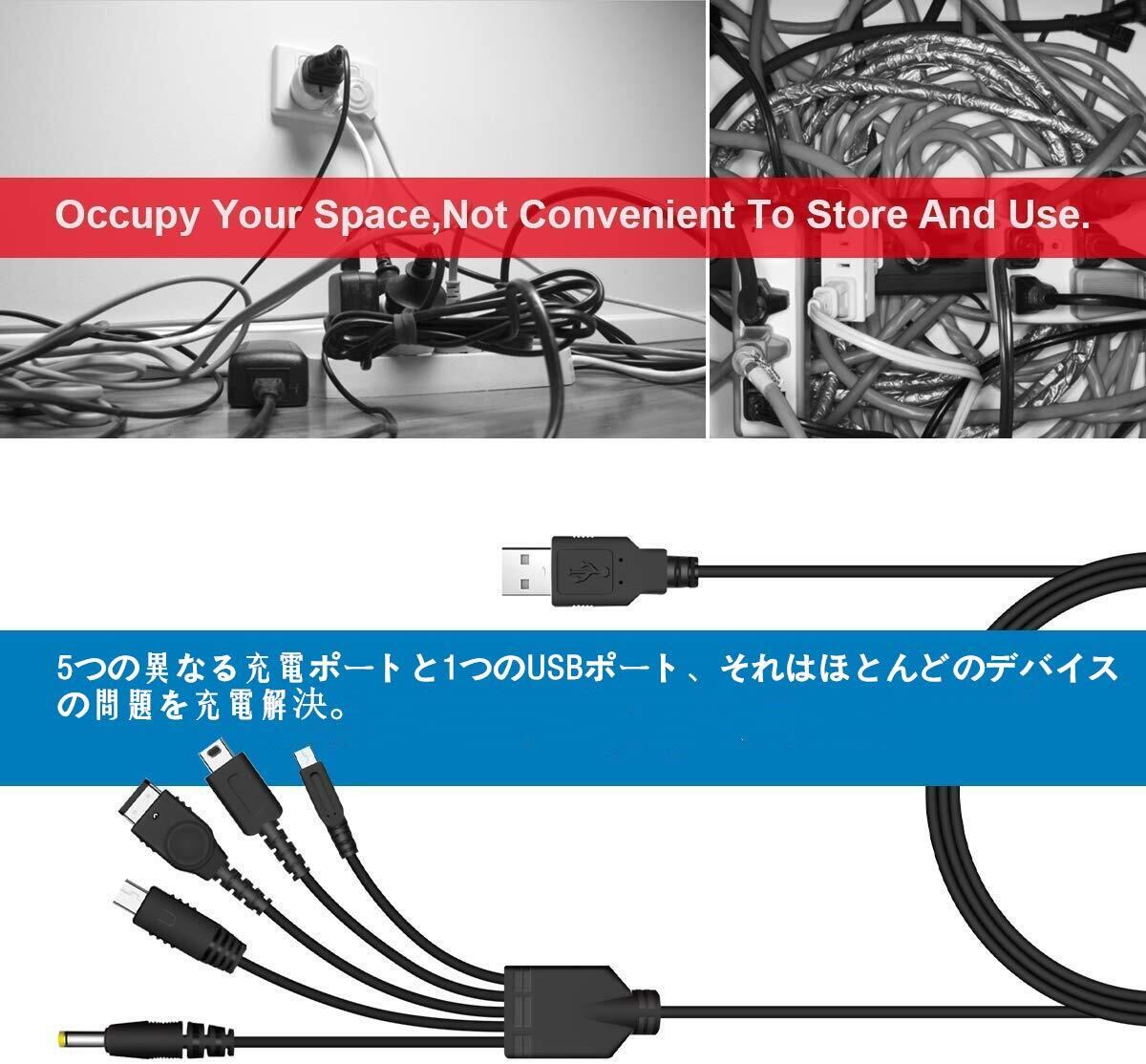 【5in 1充電ライン設計】:5つの異なる充電ポートと1つのUSBポート、for ニンテンドーNEW 3DS(XL/LL),2DS,DSi(XL/LL)、NDS Life、Wii U、PSP(1000/2000/3000)、GBA SPの充電がコレ1本で出来る、「5 in 1 USBケーブル」の発売を開始しました!※ご注意:任天堂の携帯型ゲーム機器はデータ転送機能がありませんので、本商品が充電しか使用しません。