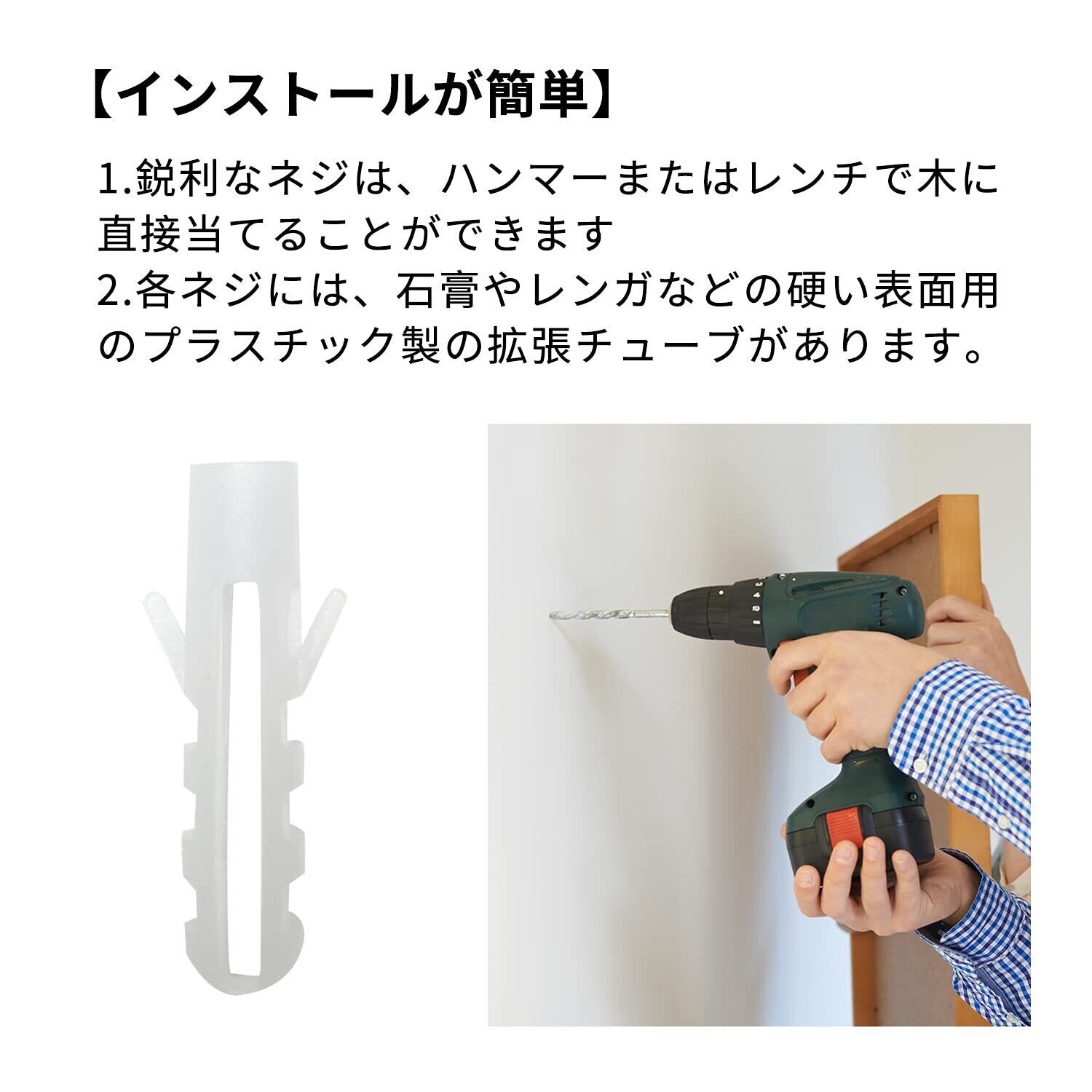 【取り付けは簡単です】鋭いねじはハンマーやスパナで直接木に当たることができます。各ねじはプラスチックの膨張管を備えており、石膏板やレンガなどの硬い面に使われています。すべての固体の表面に適用されます。例えば、壁、天井、レンガ、木の梁、屋外の屋根、花園などです。