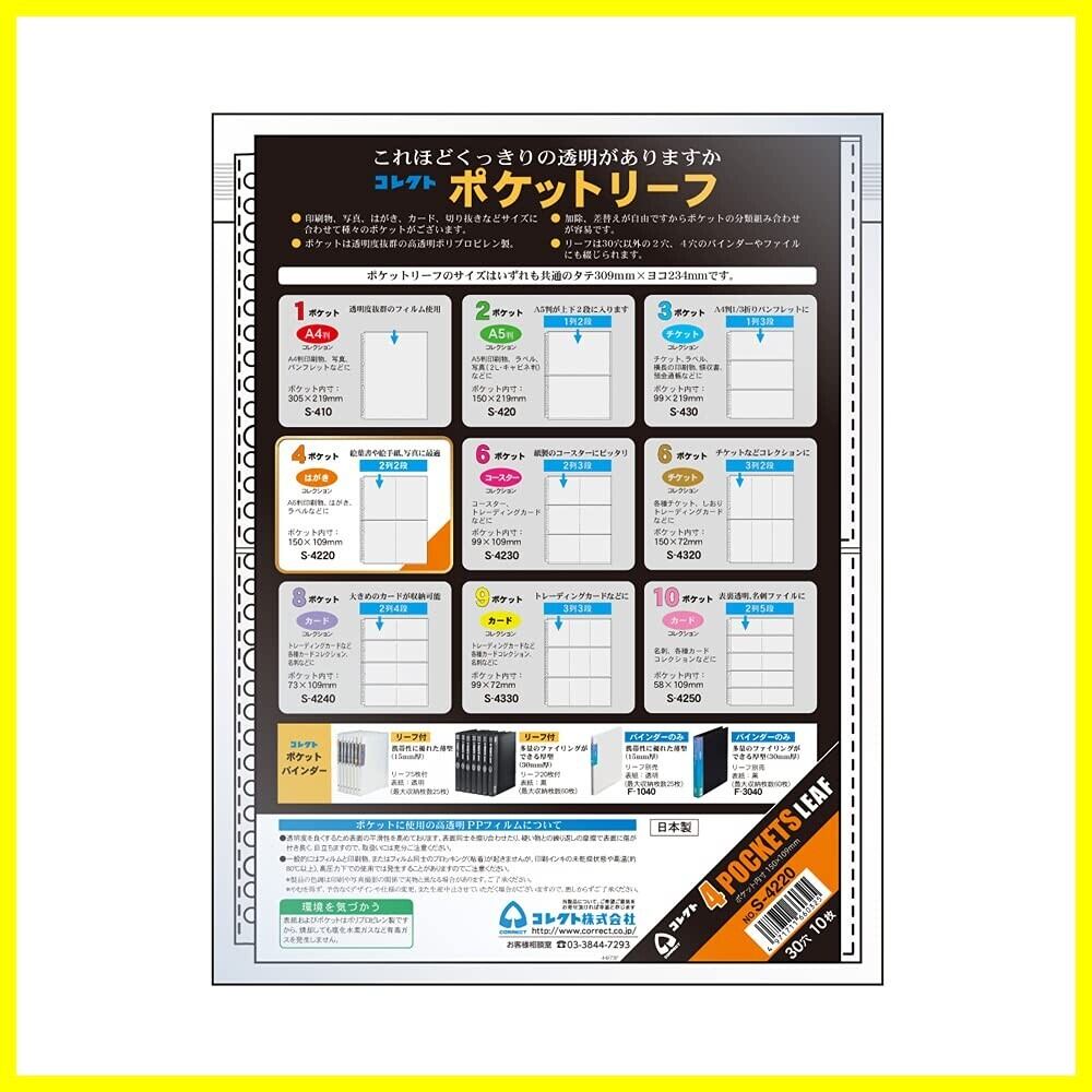 コレクト リフィル 透明 ポケットリーフ A4 4ポケット 30穴2列2段 10枚 S-4220 プラスチック