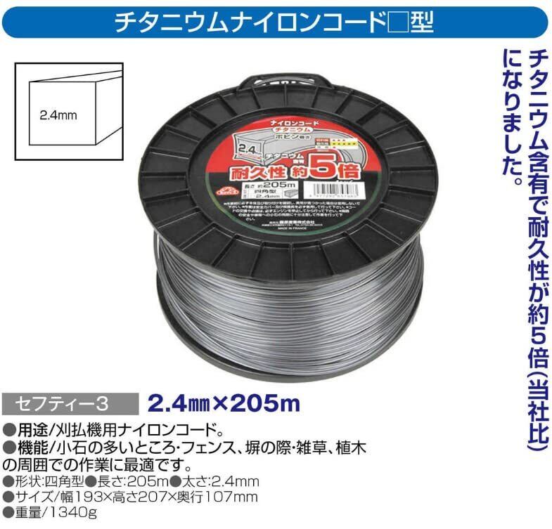 セフティー3(Safety-3) 草刈・刈払機用 耐久性約5倍 チタニウムナイロンコード 205m 四角型 2.4mm径