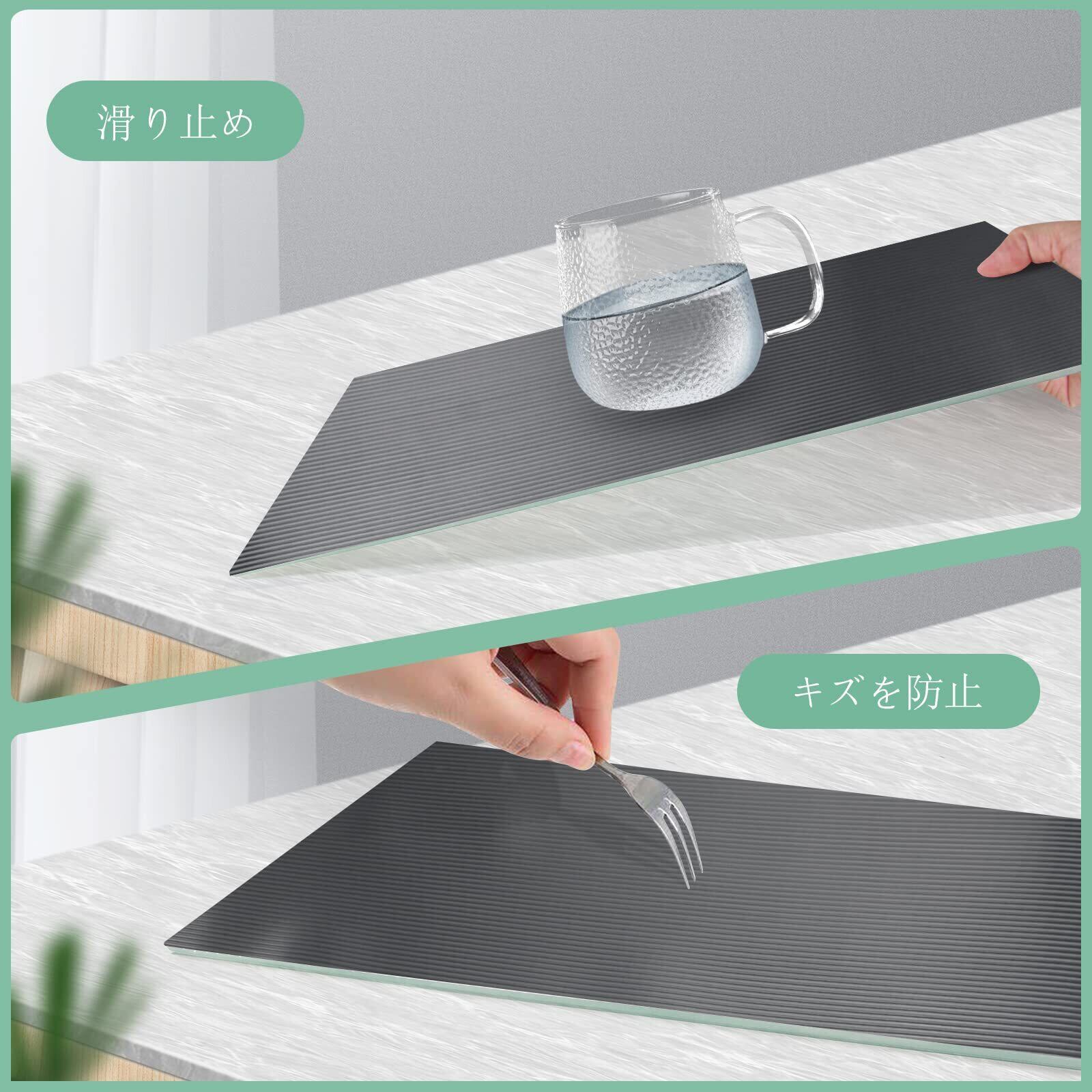「直接触れる、安全・無害」:食器棚シートは、BPAを含まない食品用EVA素材で作られていて、人体には無害です。商品は耐久性があり、-50℃~90℃の温度でも変形しません。クッション性も高く、事故防止だけでなく、引き出しや冷蔵庫、テーブルの上やカウンターに傷がつくのを防ぐことができます。