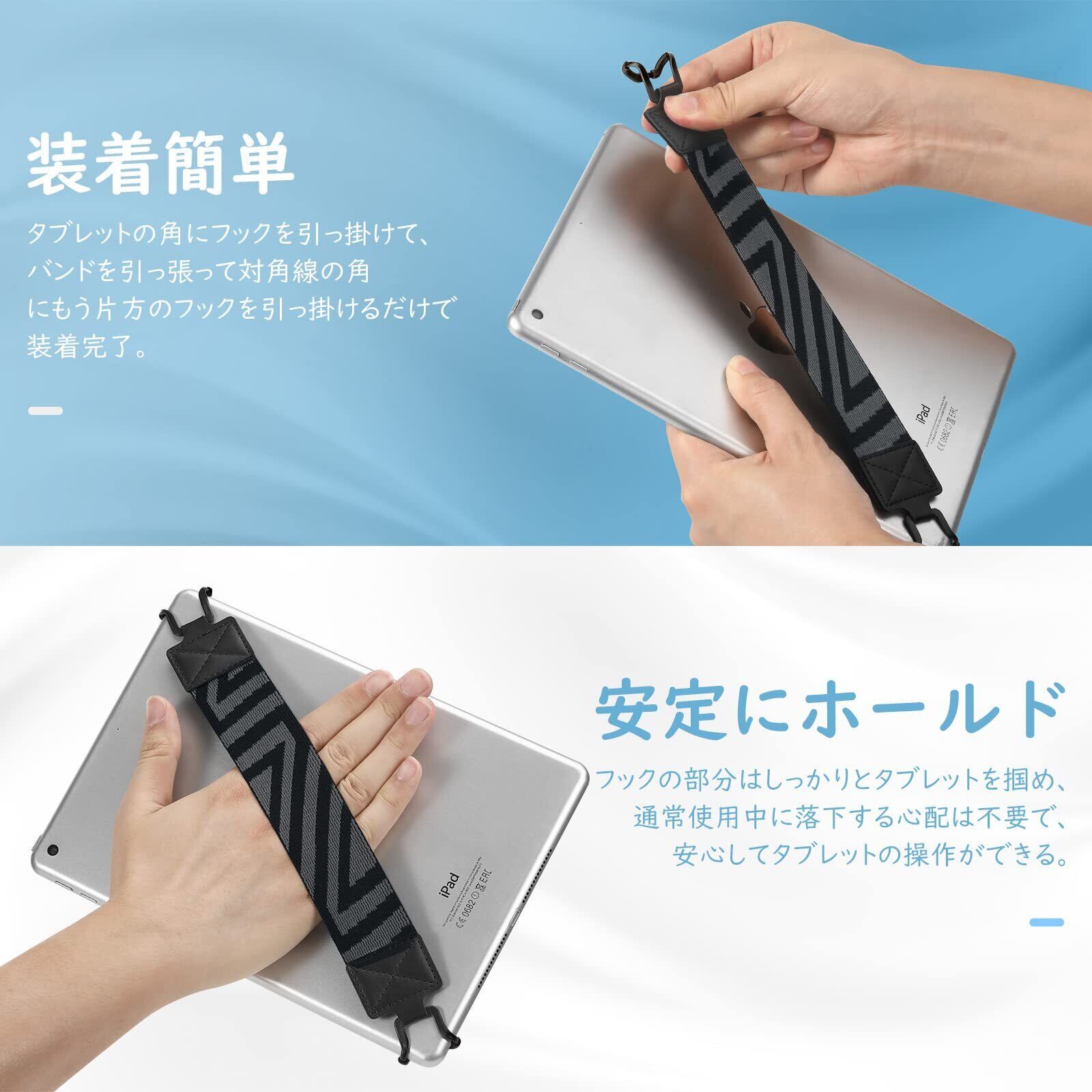「上質素材採用」 優れた伸縮性がある弾力バンドを採用し、幅広い機種に対応でき、長時間使用しても緩みにくいです。上質なPUレザーを使用してフックの部分と丁寧に縫い合わせて、丈夫で引き裂けする心配は不要です。フックの部分は一定の靭性があるラバー素材を採用し、タブレットに取り付けても大切な端末に傷つきません。
