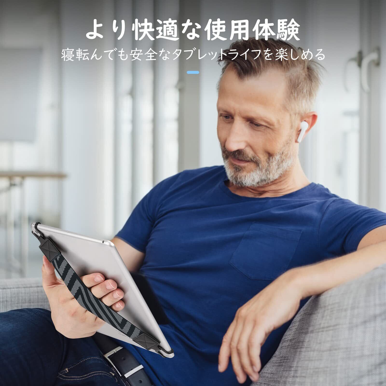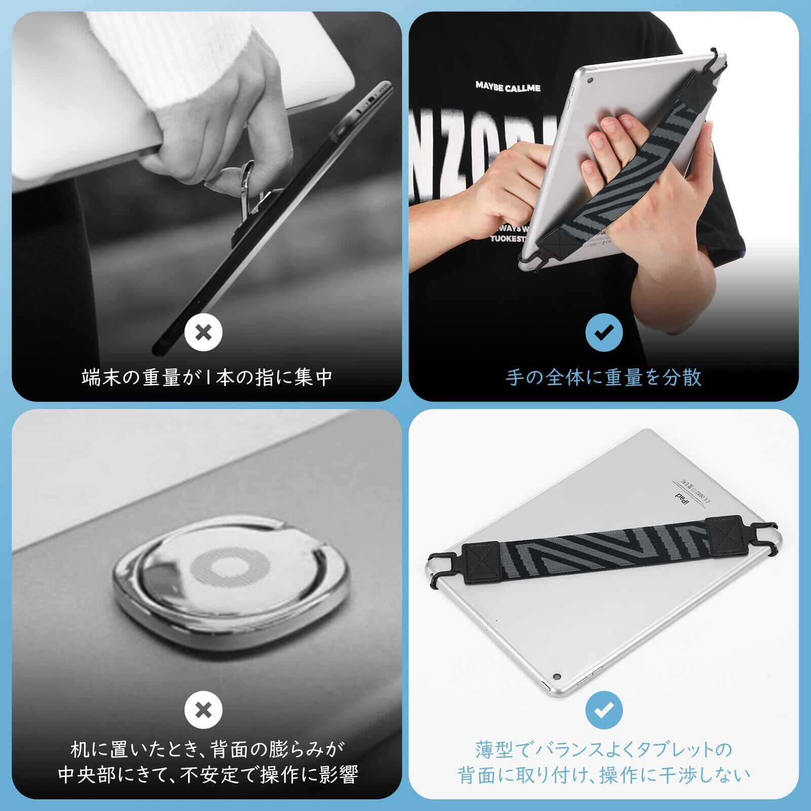 「片手持ち便利アイテム」 長時間タブレットを持っていると重く感じて手が疲れますが、このアイテムがあれば、タブレットの重量を手の全体、更に手首まで分散でき、より快適にタブレットを使えます。使用中手の疲れやうっかりして落下するリスクも防げます。厚めの保護ケースを付けた場合は本製品を取り付けられないことがありますので、ケースを外して、または薄型のケースを付けて本製品をご利用ください。
