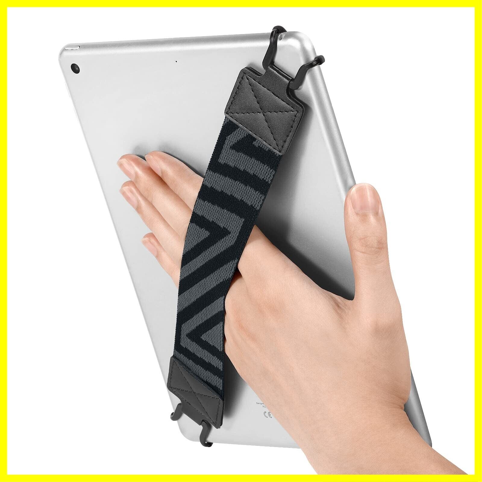 「対応機種」 伸縮性があるバンドを採用し、iPad 10 10.9"、 iPad 9/8/7 10.2"、 iPad 6th 9.7"、 iPad Air 5/4 10.9"、iPad Air 3 10.5"、iPad Pro 11 2021/2020/2018、 iPad Pro 10.5" 2017、iPad Pro 9.7" 2016、Fire HD 10 & 10 Plus 2021、Kindle Scribe 10.2"など9~11インチまでのタブレットに適用します。両端のフック+弾力バンドの伸ばされていない状態下の全長は約18CMになりますので、ご購入の前に、お手元の端末の寸法を予めご確認ください。