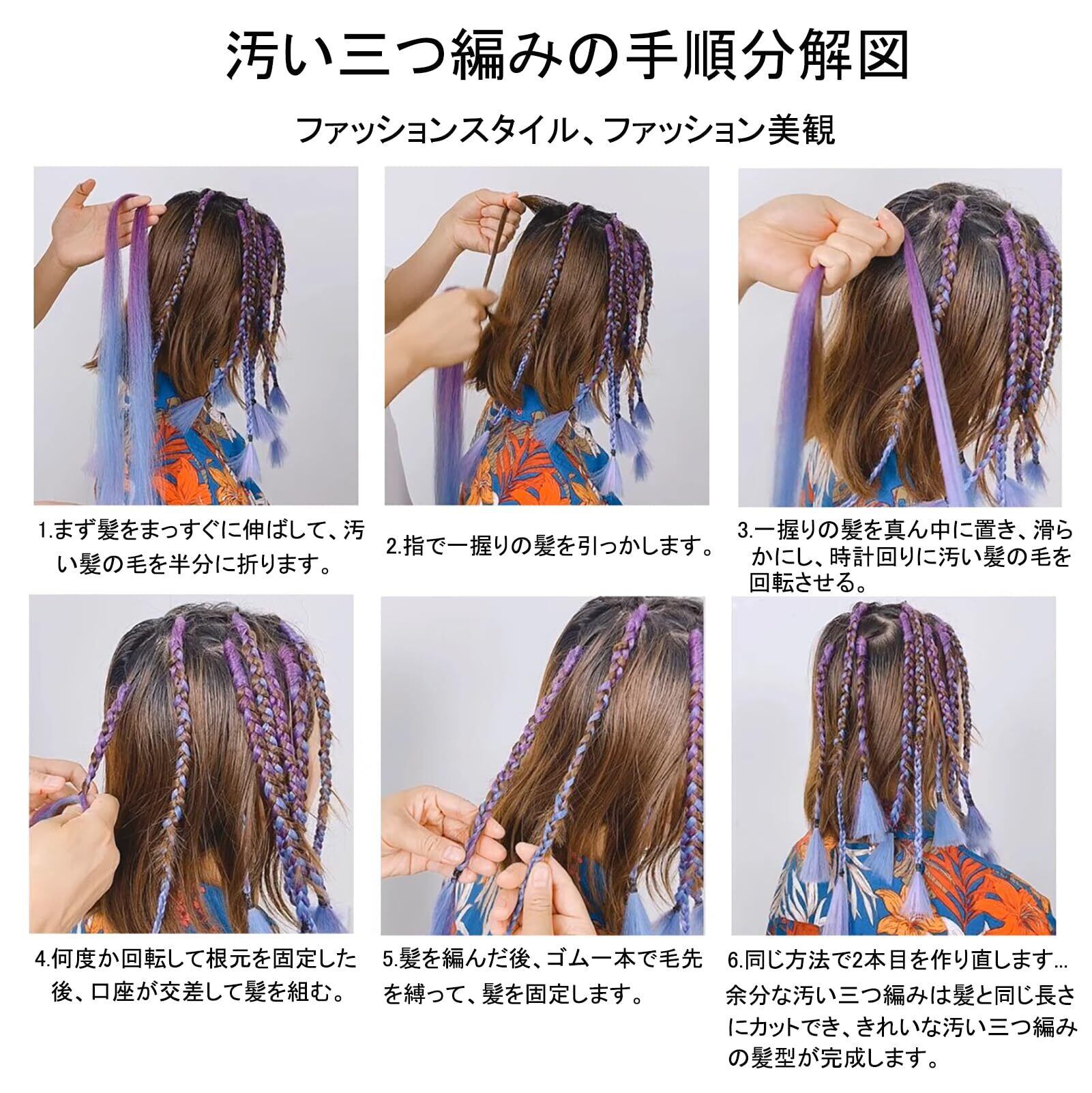 【使い方】ビッグマックを分けて小束にし、数本に分けて半分に折り、自分の髪にのせる。次に三つ編みをして、輪ゴムで固定します。すると、完成です。