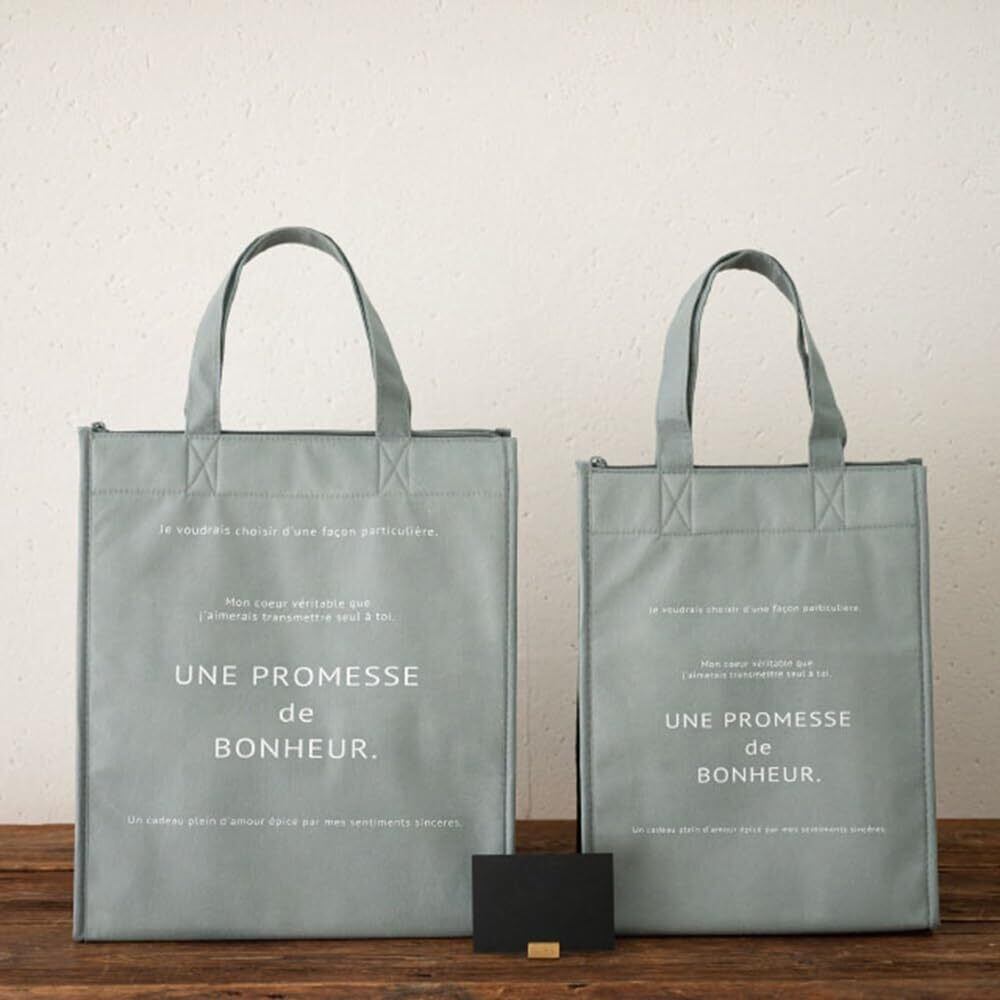 シンプルな欧文デザインが人気のボヌールシリーズの保冷バッグです。ケーキ用のサービス箱がすっぽり入る大き目のマチと、保冷剤を入れるポケットがついていて機能性もバツグン。エコバッグとしてリユースにもおすすめです。 落ち着いた色味と飽きの来ないデザインで、年齢や性別を問わずご愛用していだだけます。