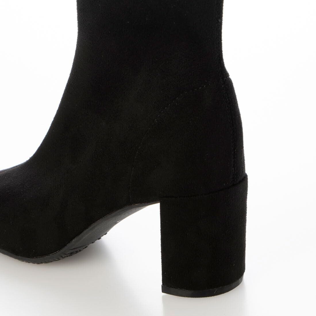柔らかく、ストレッチの効いた材料を採用したスクエアブーツ。やや短めの丈感はバランスが取りやすく、コーディネートをすっきり見せてくれます。特徴的な形のヒールは、横から見た時の細身なシルエットがポイント。約7cmのヒールですが、幅があるので安定感も抜群です。シルエットが程よくフィットするので美脚効果も期待できます。