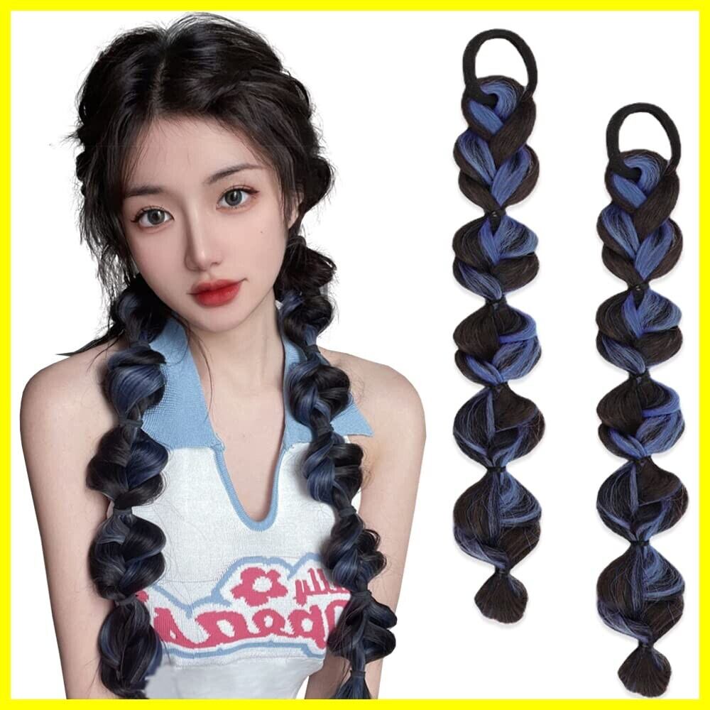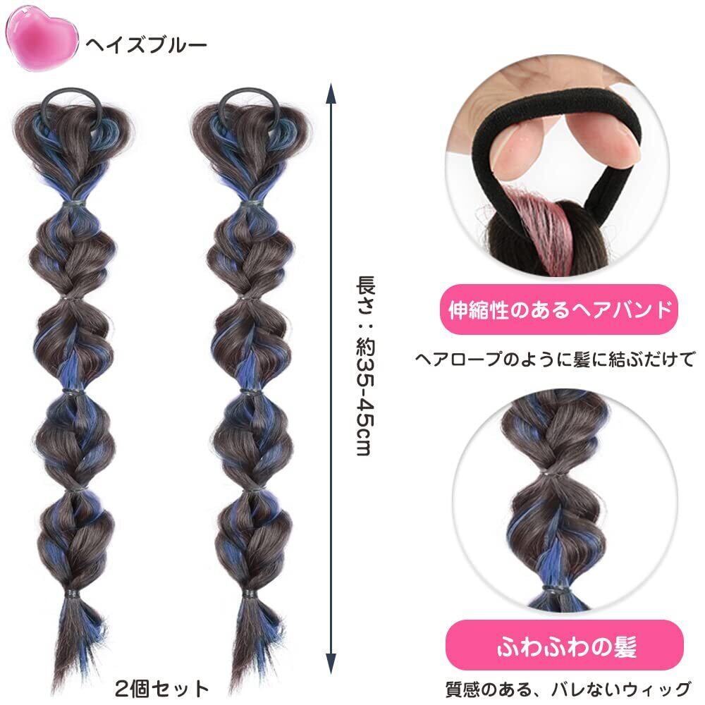 ヘアエクステ 三つ編み ウィッグ 2個セット 取り付け簡単 カラーエクステ 編み込み 髪の毛 ポニーテール 延長 ツインテール デュアルテール 自然 おしゃれ 着脱簡単 少女 レディース 発表会 イベント フェス パーティー 誕生日会 子供 大人 (ヘイズブルー)
