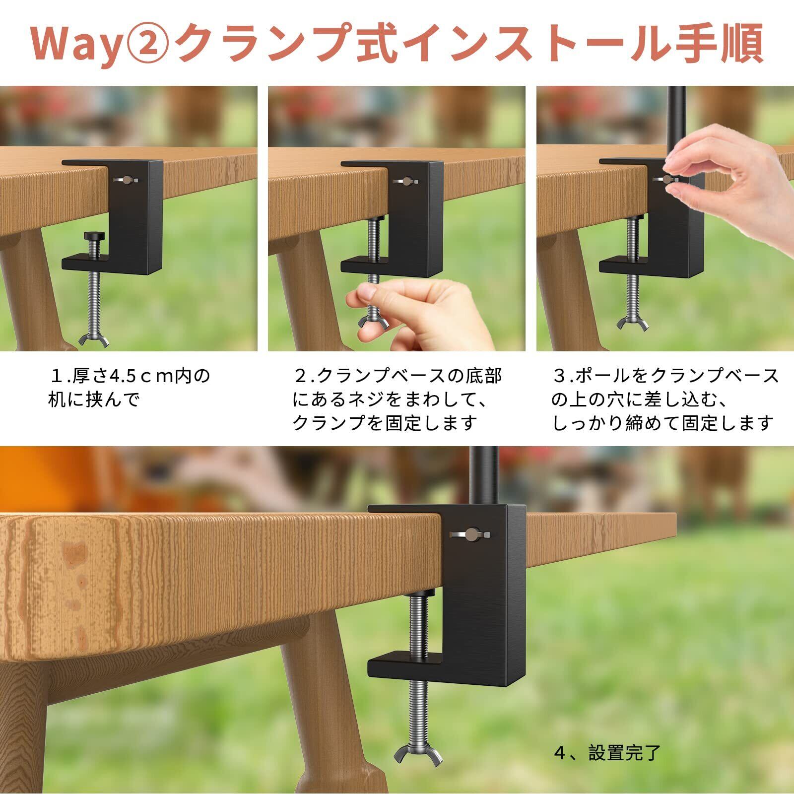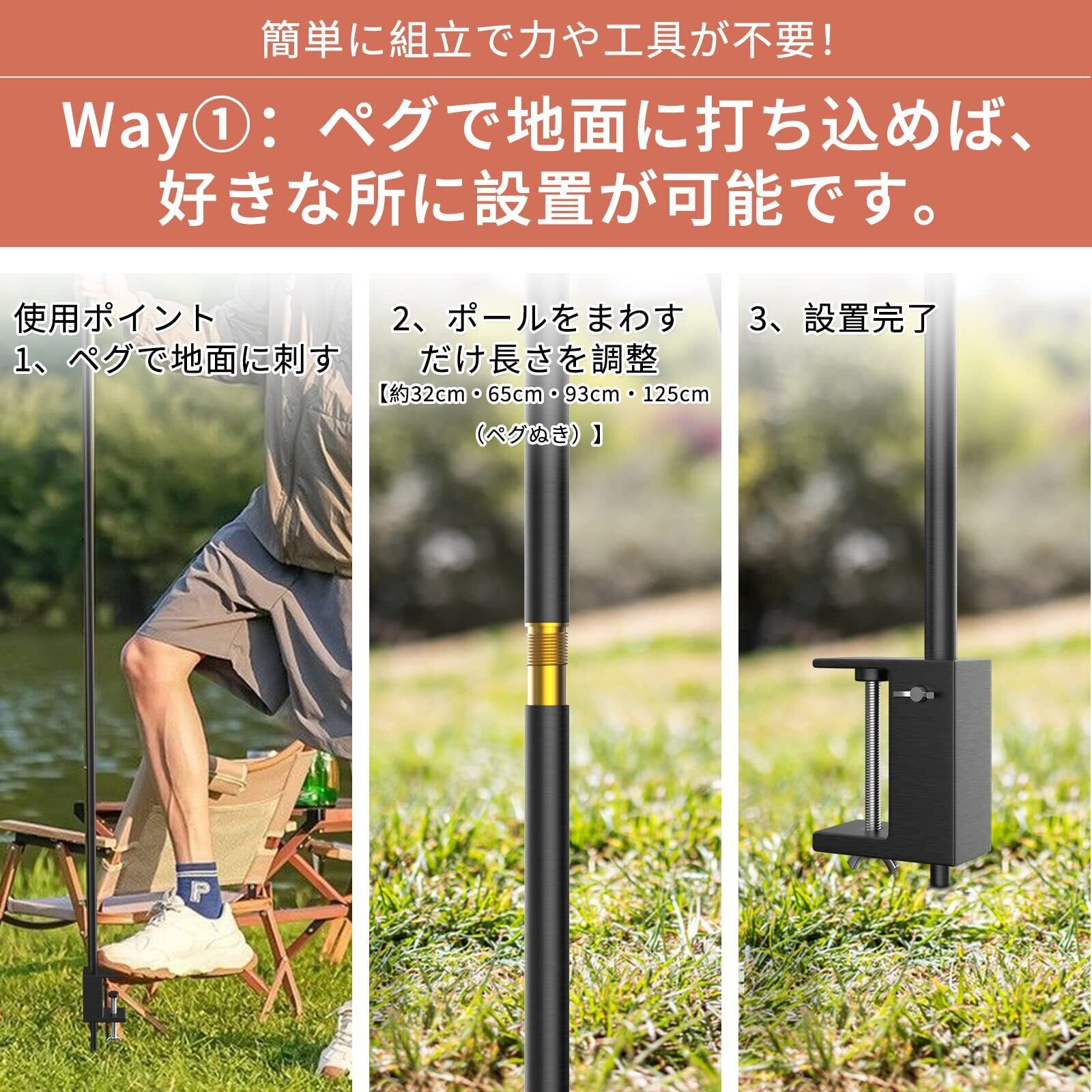 【2WAY ペッグ&卓上式-組み立て簡単】ランタンスタンドは地面にも挿せ、卓上にも着用可能。ペグで地面に打ち込みを選べば、好きな所に設置が可能です。付属のクランプでテーブル(厚み4.5cm内)の端に設置すれば、スペースを節約できます。高い位置から360度の灯りが得られ、美しい雰囲気を作り出します。