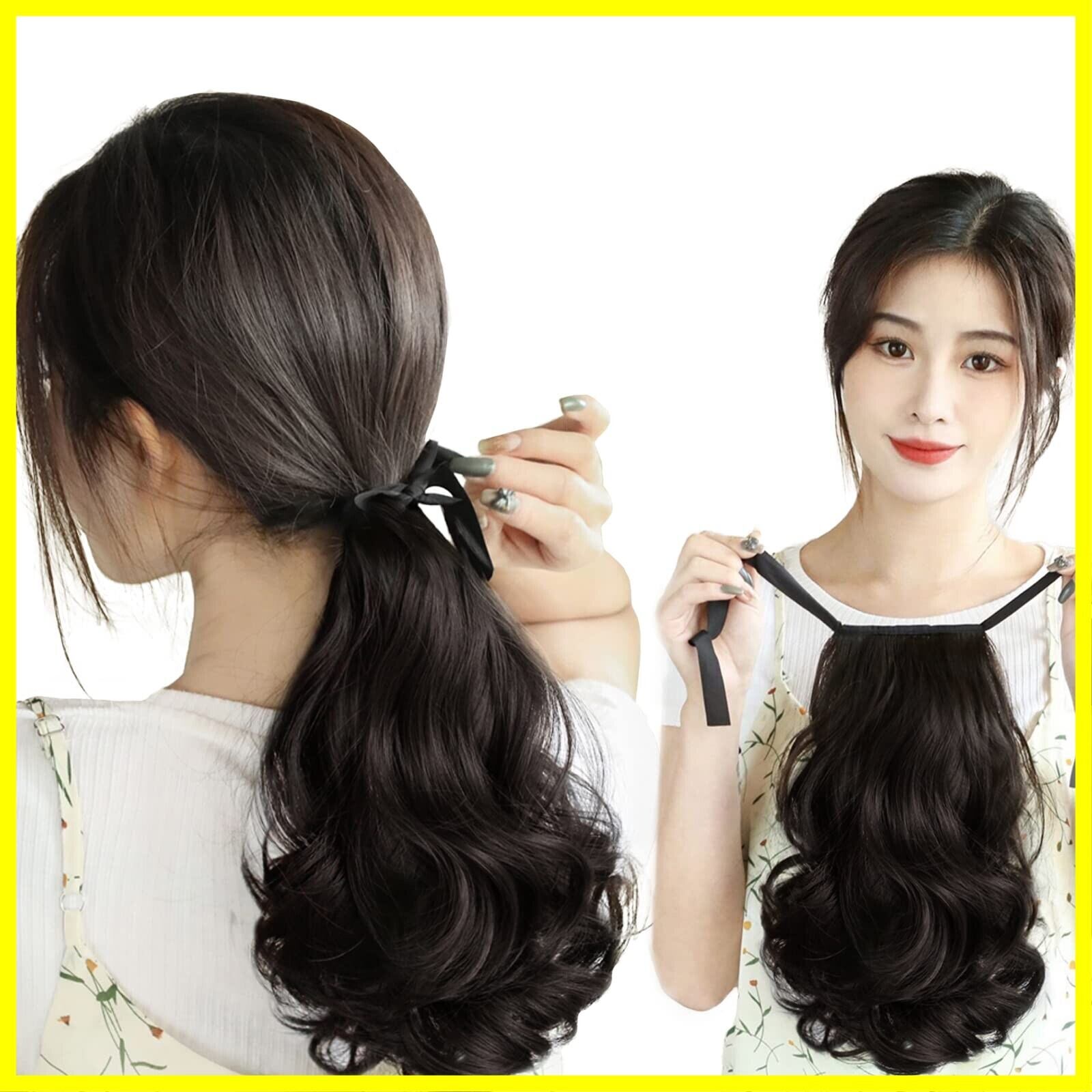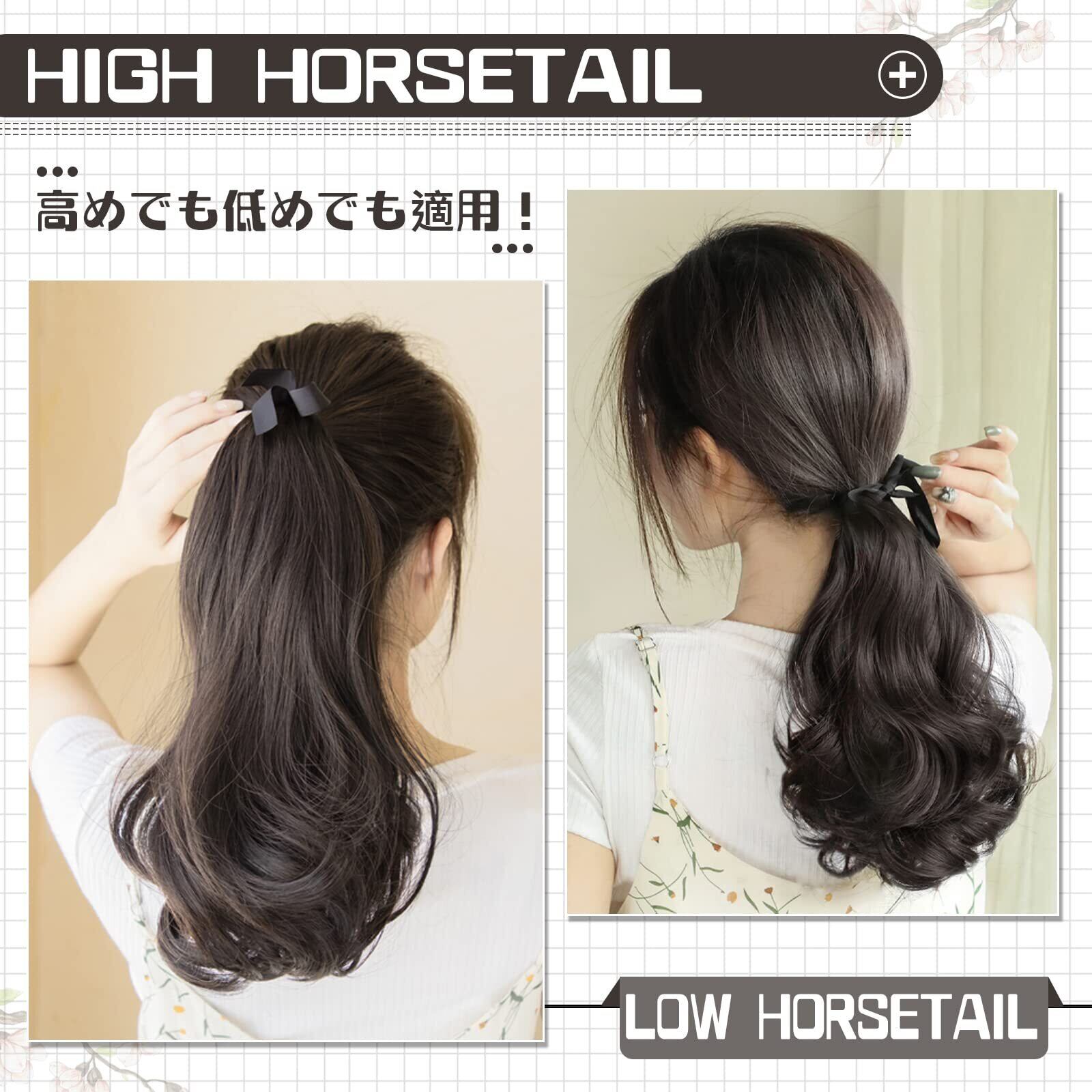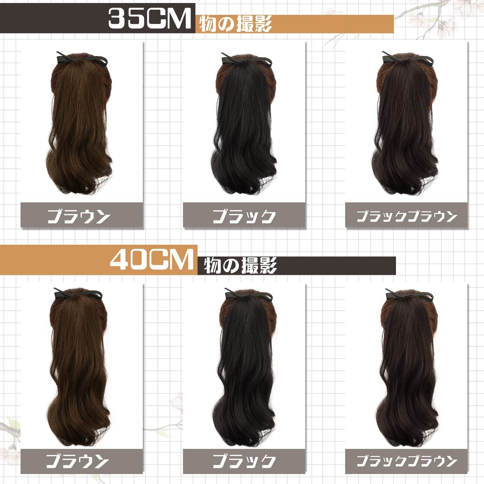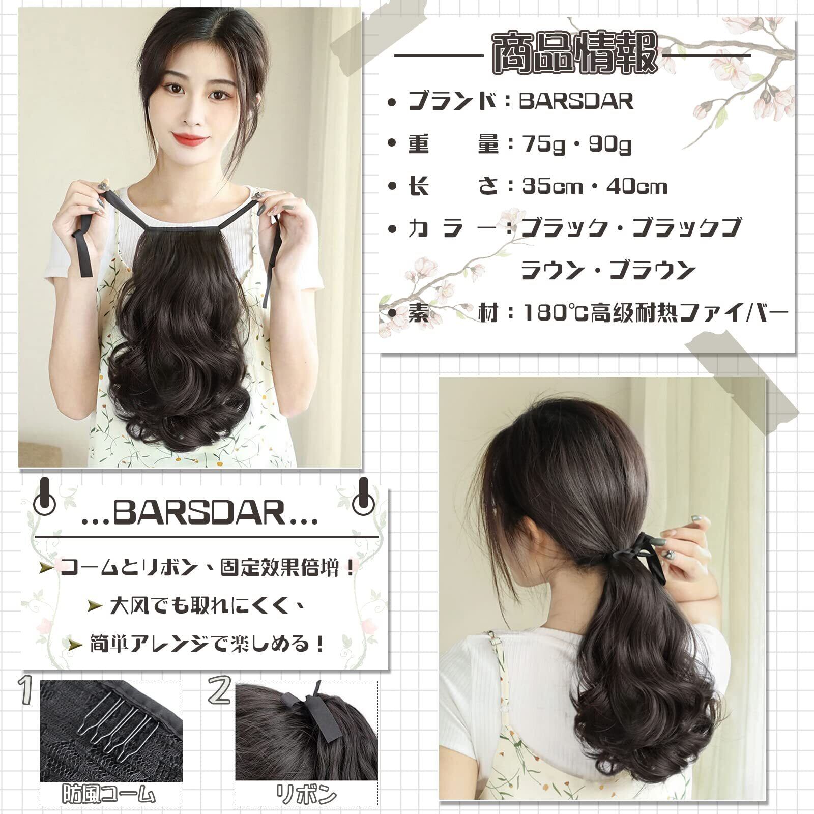 BARSDAR エクステ ポニーテール ウィッグ つけ毛 カール ロング ポイントウィッグ リボン 自然 長さ 35cm 40cm コスプレ 3色選び(ブラックブラウン×35cm)