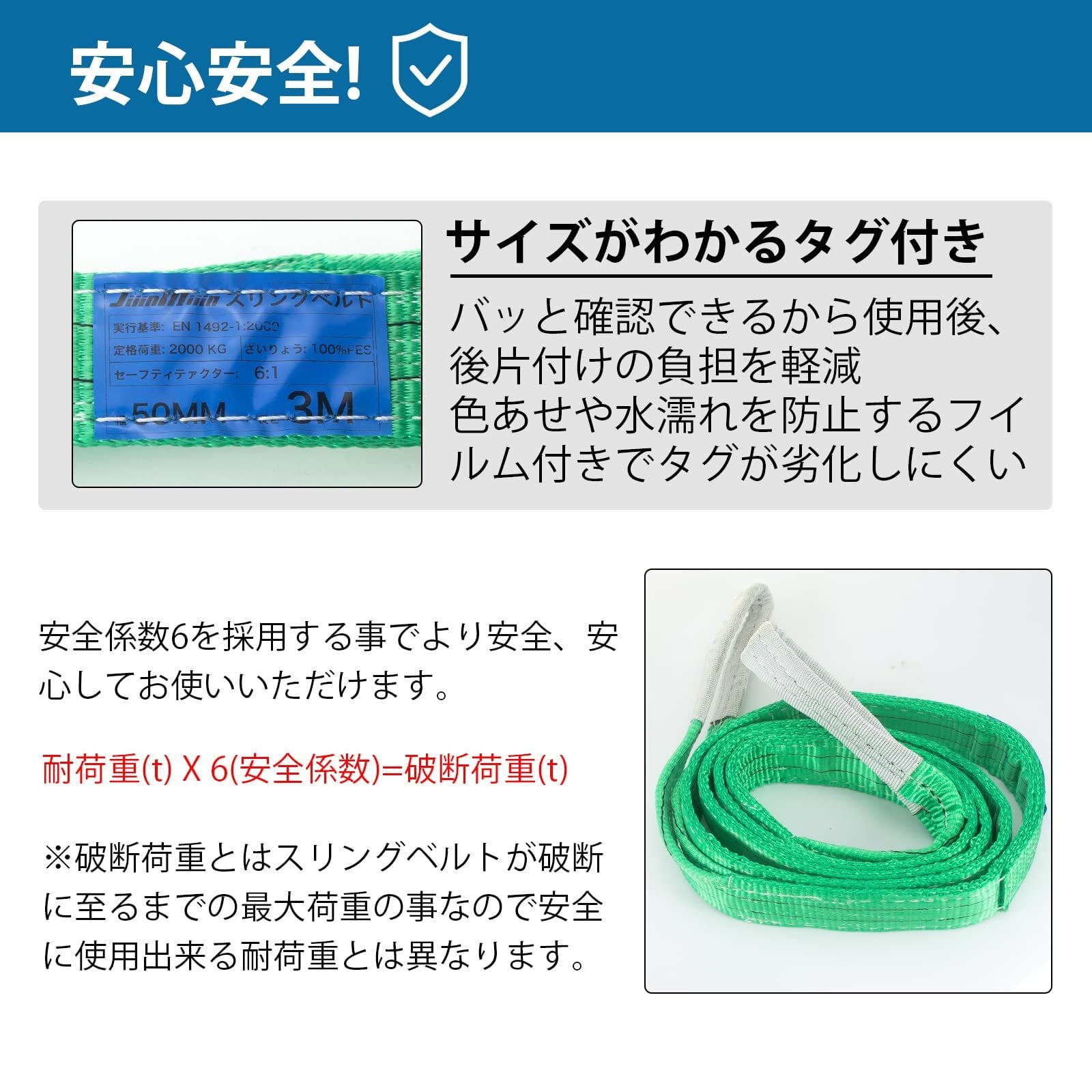 【商品仕様】■全長:3M ■ベルト幅:50mm ■緑 最大使用荷重:2000kg (ストレート吊の場合) ■安全係数:6