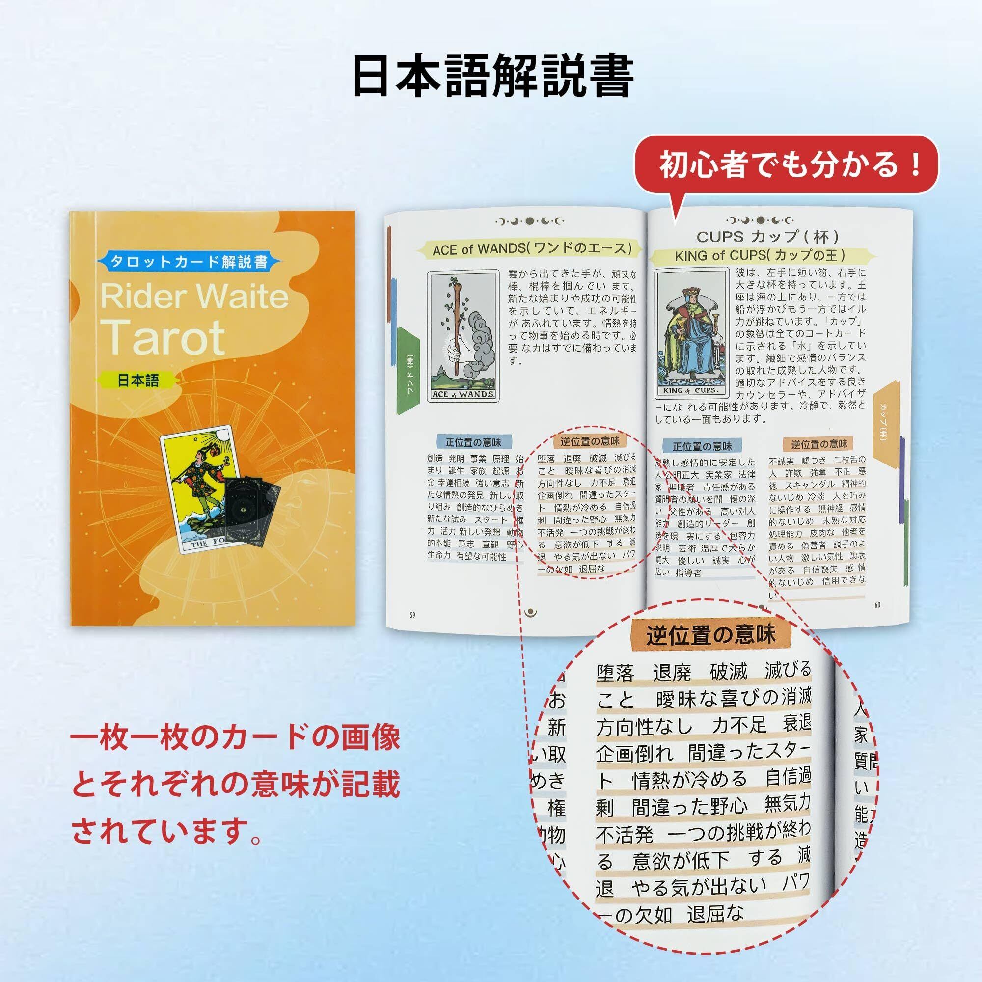解説書:日本語解説書が付属しているため、初心者向けタロットカードとして最適です。各カードには対応する解説書のページ番号が記載されており、学習が容易になります,タロット占いの旅を始めるのにぴったりです。