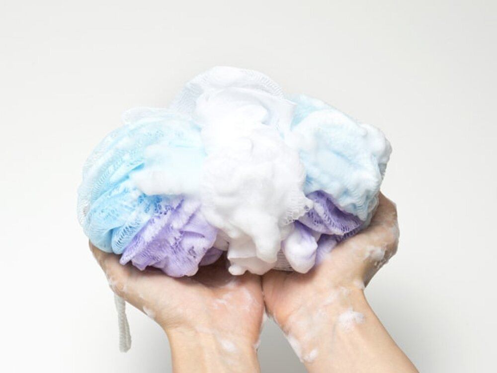 泡立てネットに石けんやボディーシャンプーを入れ、体に当てて泡立てます。