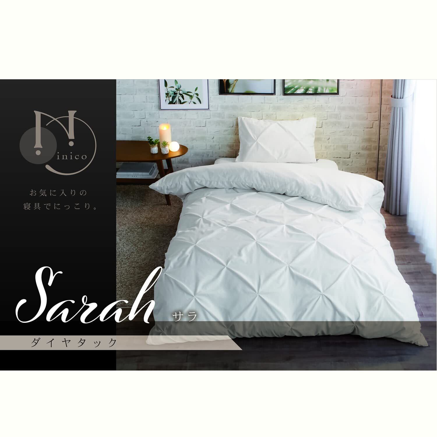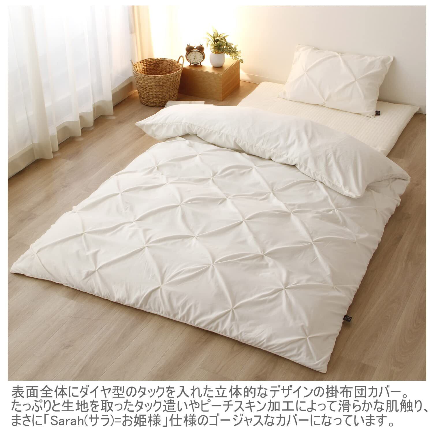 表面全体にダイヤ型のタックを入れた立体的なデザインの掛布団カバー。たっぷりと生地を採ったタック遣いとピーチスキン加工による滑らかな肌触りが、「Sarah(サラ)=お姫様」仕様のゴージャスなカバーになっています。