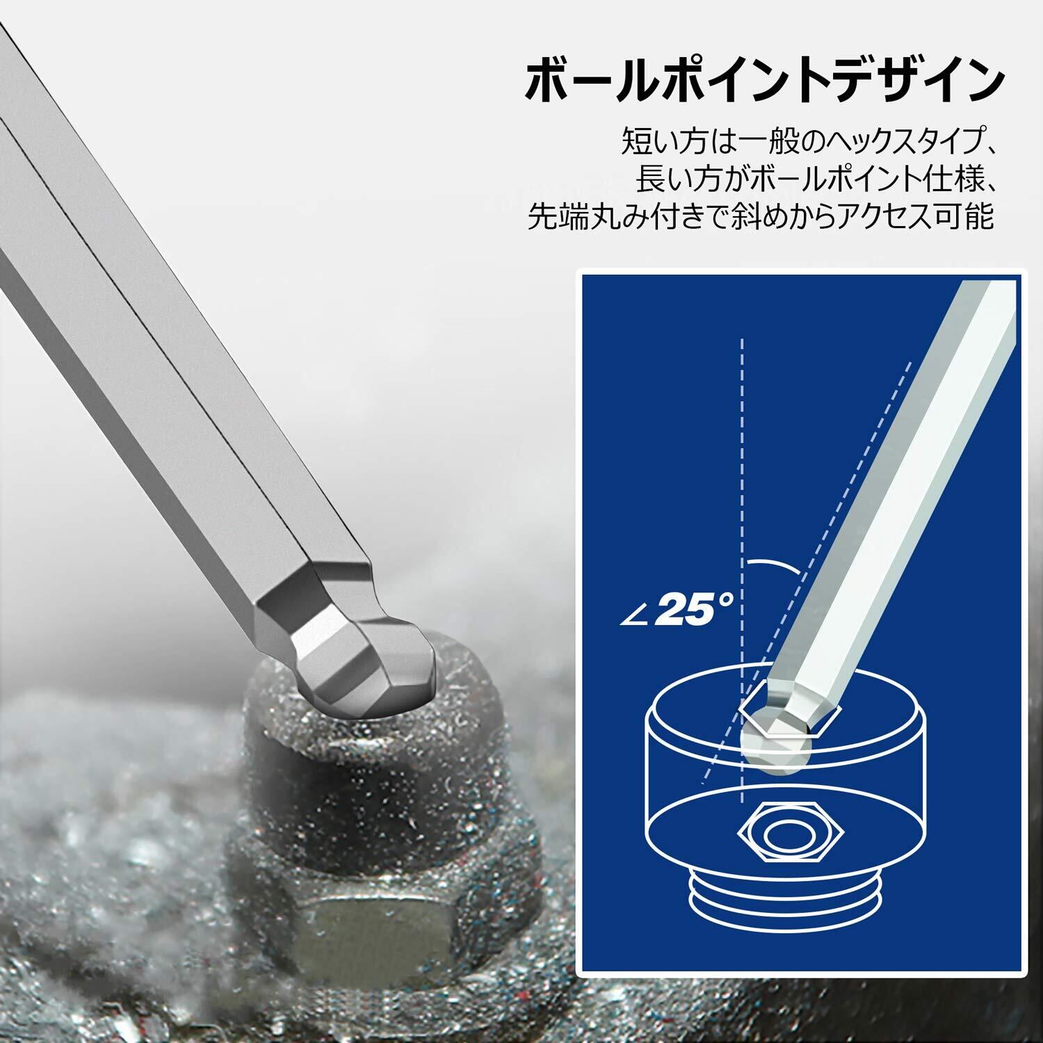 「使いやすい」六角レンチには、先端が丸くなっているボールポイントタイプがあります。ボールポイント形状により傾斜約25度で斜めから回すのも締め上げも楽にできます。狭い場所でレンチをまっすぐに入れられない時にも重宝します。