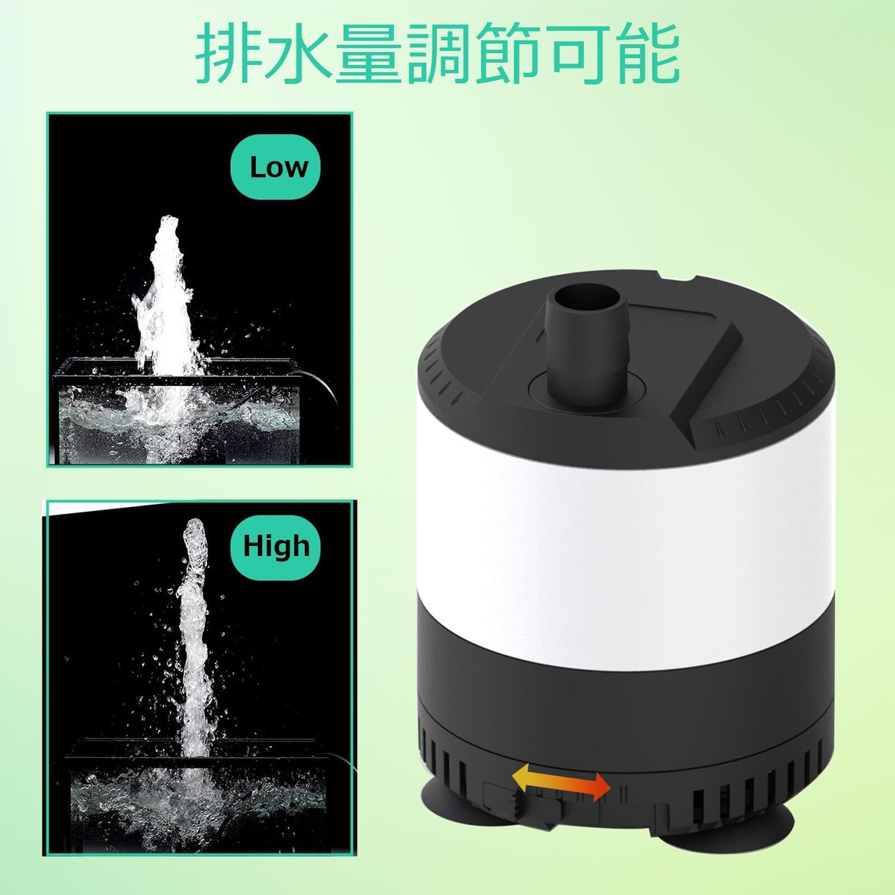 【水量調整可能】流量調整スイッチがあって、2500L/Hまで流量を簡単に調整できます。様々なシーンに合わせて好きなだけに水量を制御できます。流量の調整を通して、揚程の高さも調整できます。