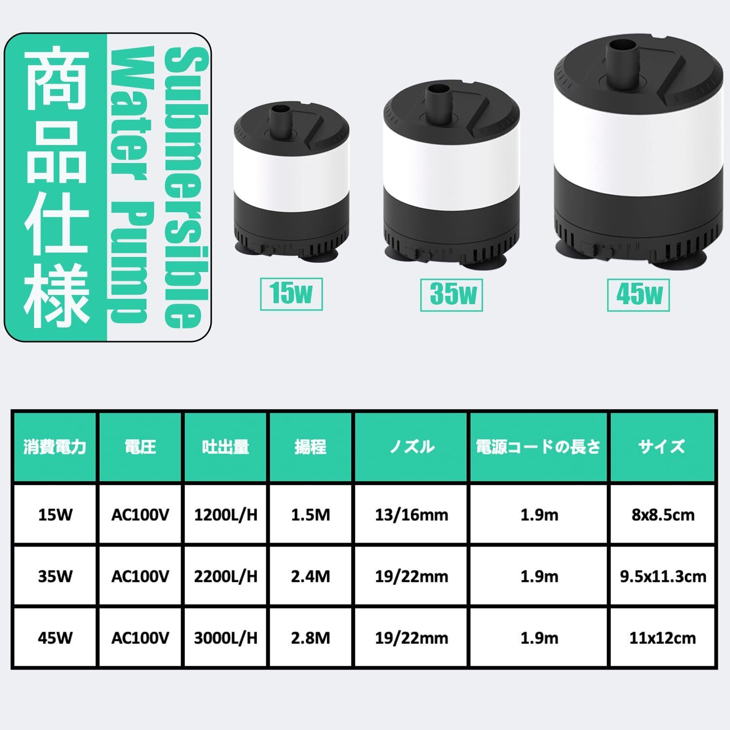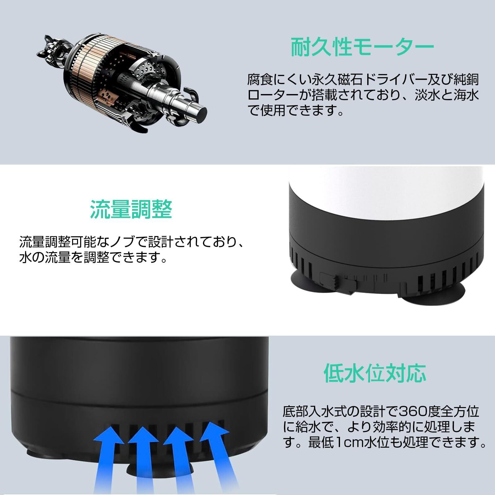 【幅広い用途】小型水中ポンプは水族給水・排水の流れを作られるために設計されているので、水族館、噴水、魚の池、魚介類の養殖場、水耕栽培など水循環は必要な所はもちろん、家庭プールやお風呂の水を洗濯機に吸い上げるなどのご使用も楽になります。