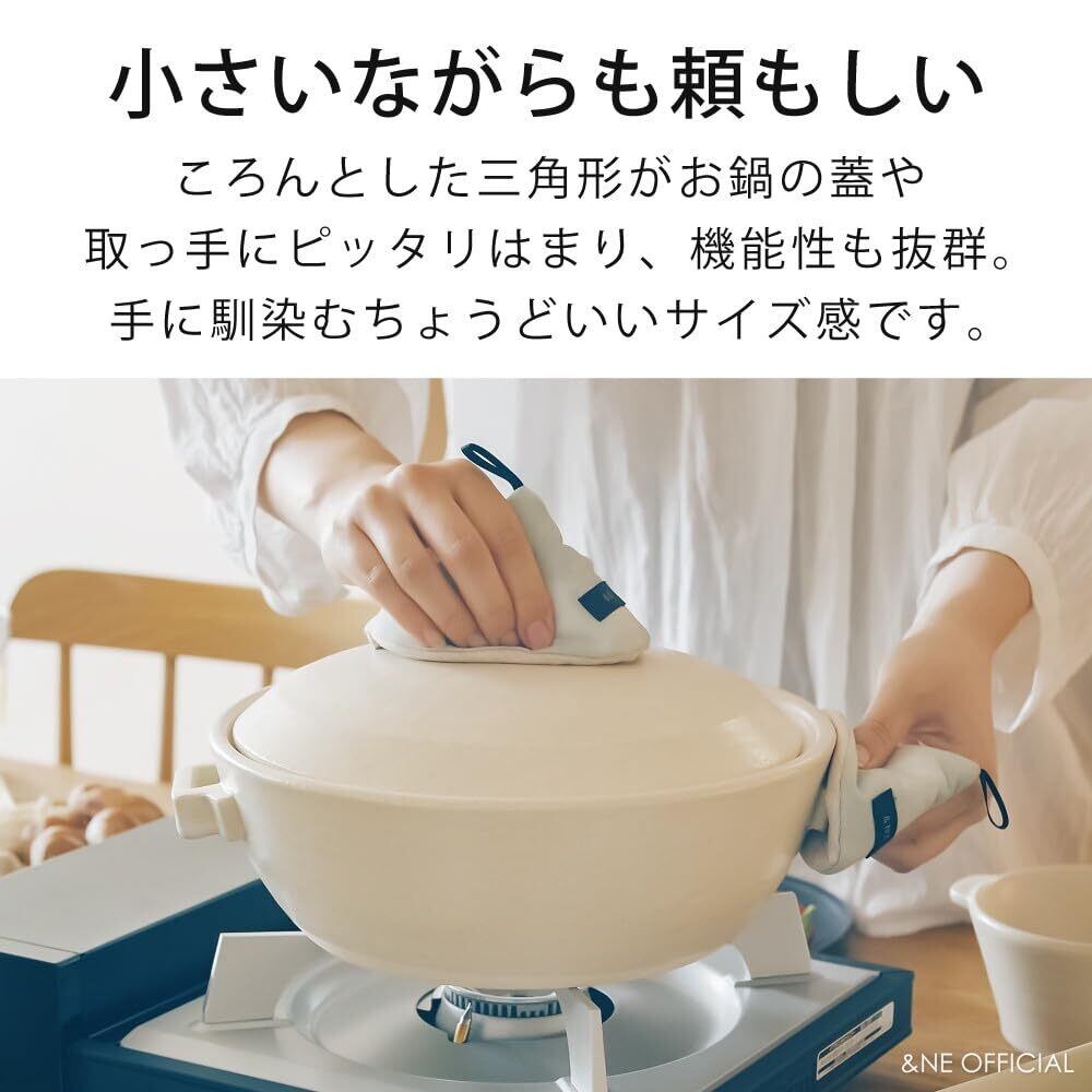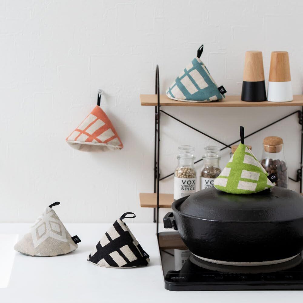 ころんとした三角形が鍋の蓋や取っ手にピッタリはまり、機能性も抜群。ふんわりとした触り心地です。紐つきなので壁につるしておくことでキッチンを彩り、お料理の時間を楽しく毎日の気分を上げてくれます。
