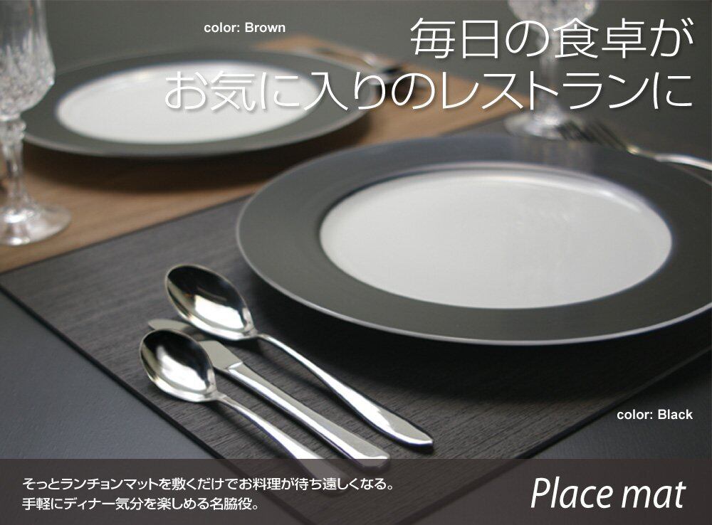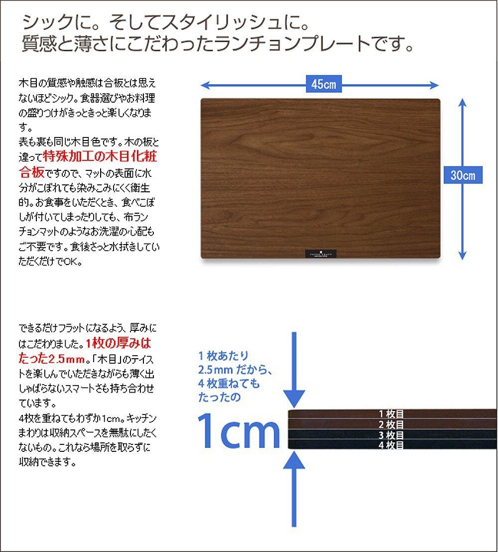 仕様 水分や食べこぼしがついても染みが出来にくい特殊加工付き。(側面には特殊加工はございません。ご注意ください。) ●収納に便利な、1枚あたり2.5mmの厚み。 ●お子さんでも簡単に取扱い出来る、重さ300gの軽量仕様。 ●どんな食卓にも映える、おしゃれな3色の木目柄(ナチュラル、ブラウン、ブラック)。 ●表裏共に使用出来るリバーシブル仕様。