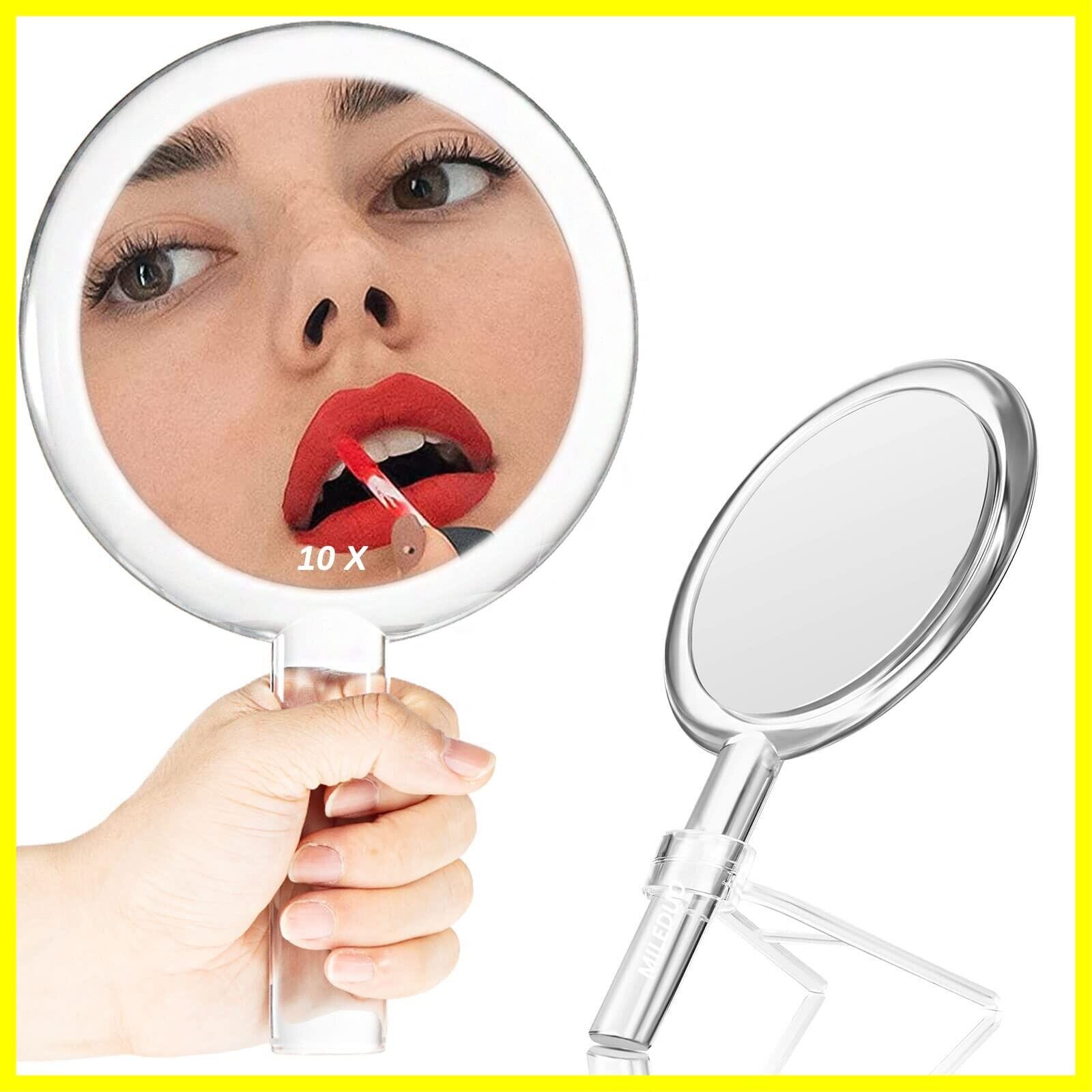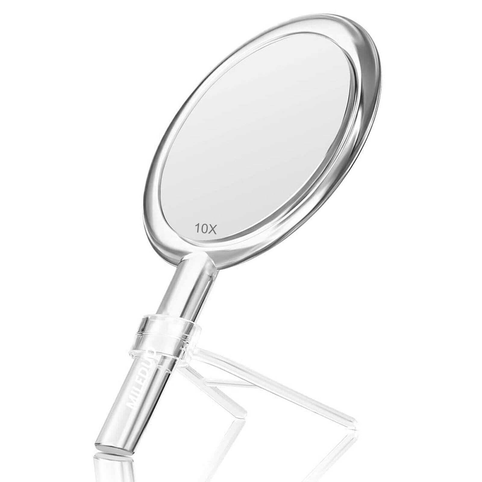 MILEDUO 手鏡 鏡 化粧鏡 両面メイクミラー 等倍と10倍拡大鏡 ハンドル付き両面鏡 卓上手鏡 スタンドミラー 円形化粧鏡 16CM クリア
